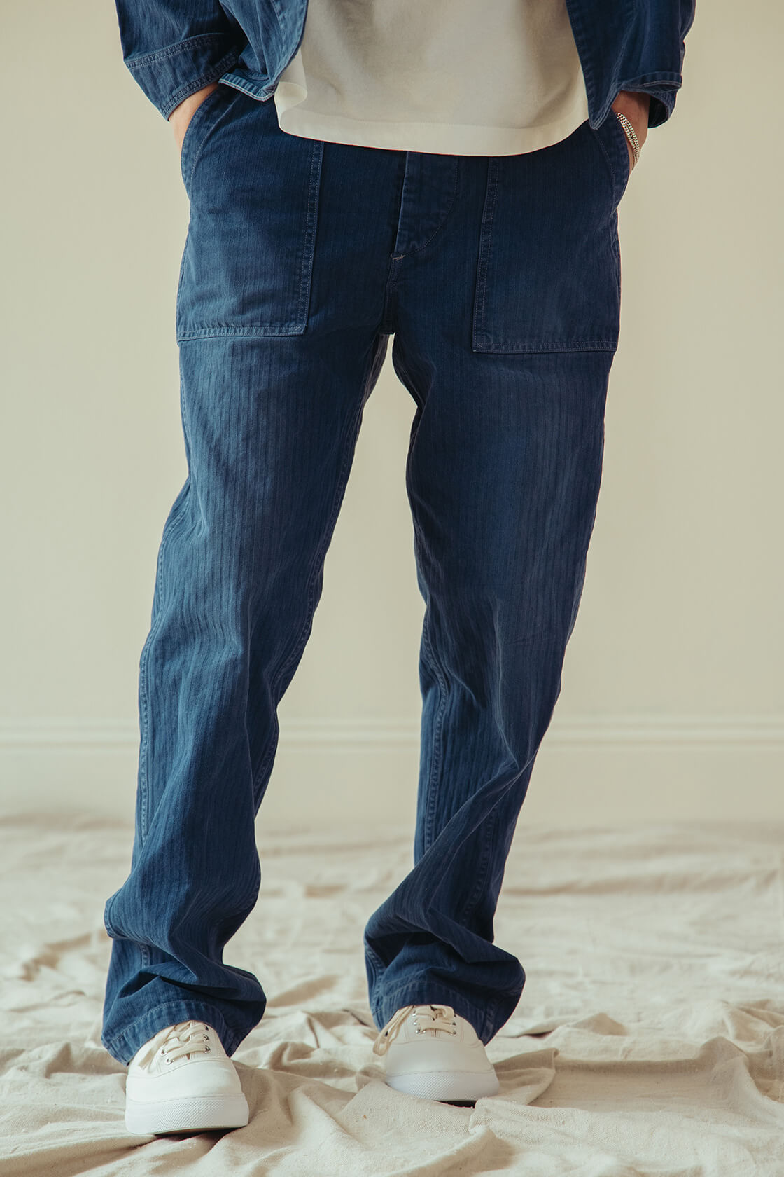 Now, about that French Blue. The color itself is an ultramarine dye originally derived from powdered lapis lazuli, and it's always been a beautiful alternative to indigo. When we first released it back in 2022, it sold out almost immediately and became one of the most requested pieces we've ever done. We heard you. For the past four years, the community has been asking us to bring it back, and here it is. The French Blue coverall and fatigue pant are returning for this release.