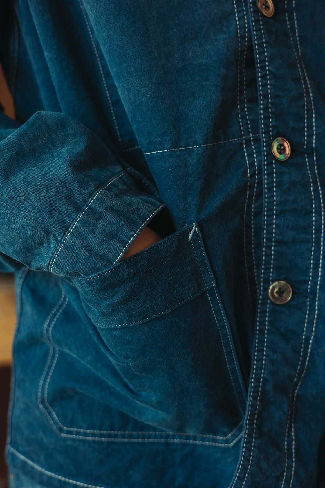 The brand is forever in dialogue with the landscape, heritage, and people of Kojima. There is a physicality to its philosophy. A coat inspired by a crack in the workshop wall. A jacket that takes its reference from the veins of a leaf under sunlight. Corduroy dreamed up in a wheat field at golden hour. It is mud. And ink. And history. And a clear vision of how it all comes together over the human body.