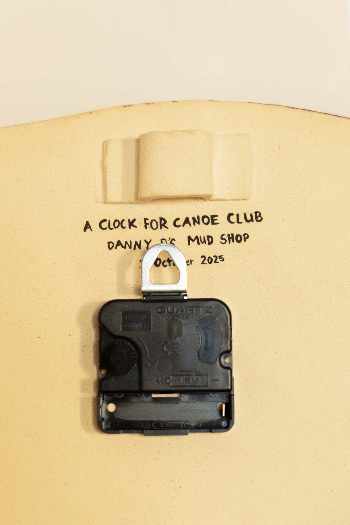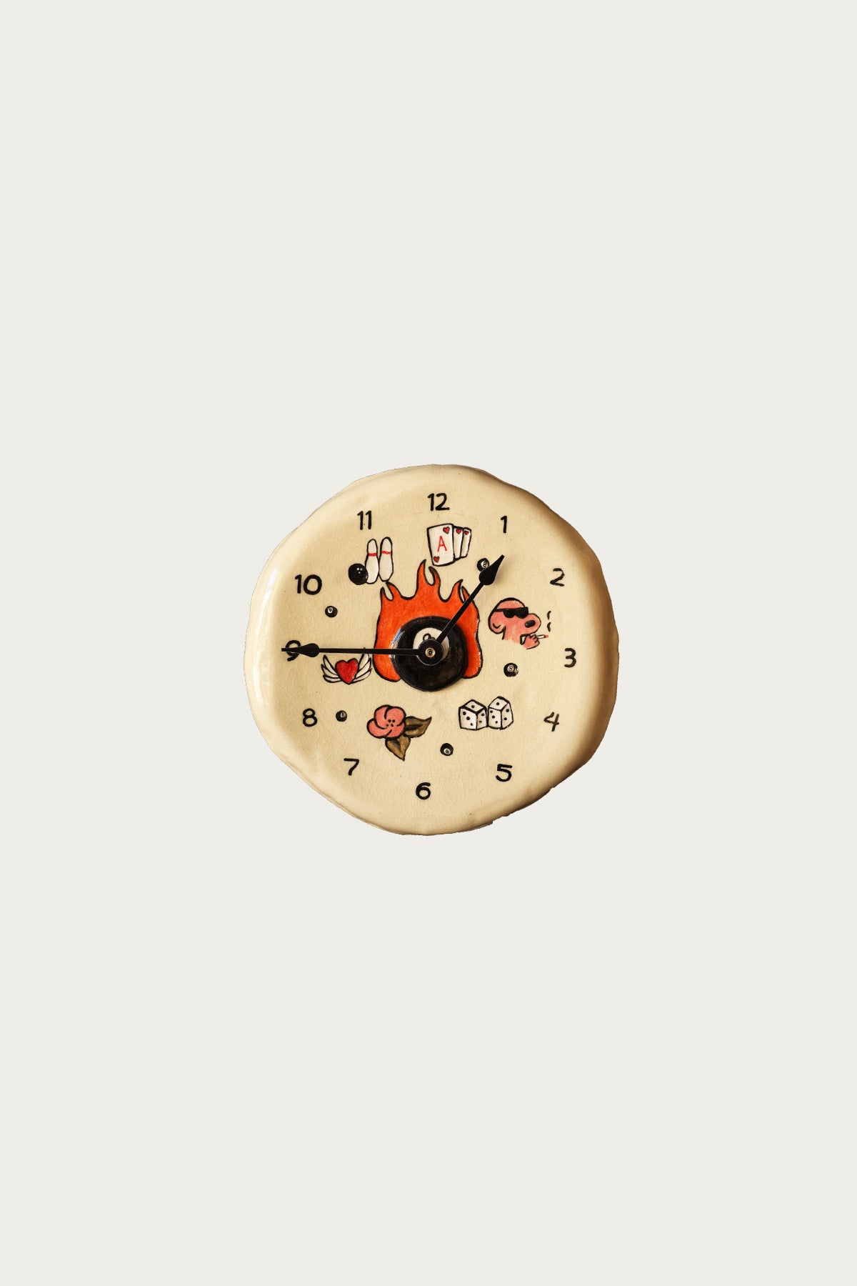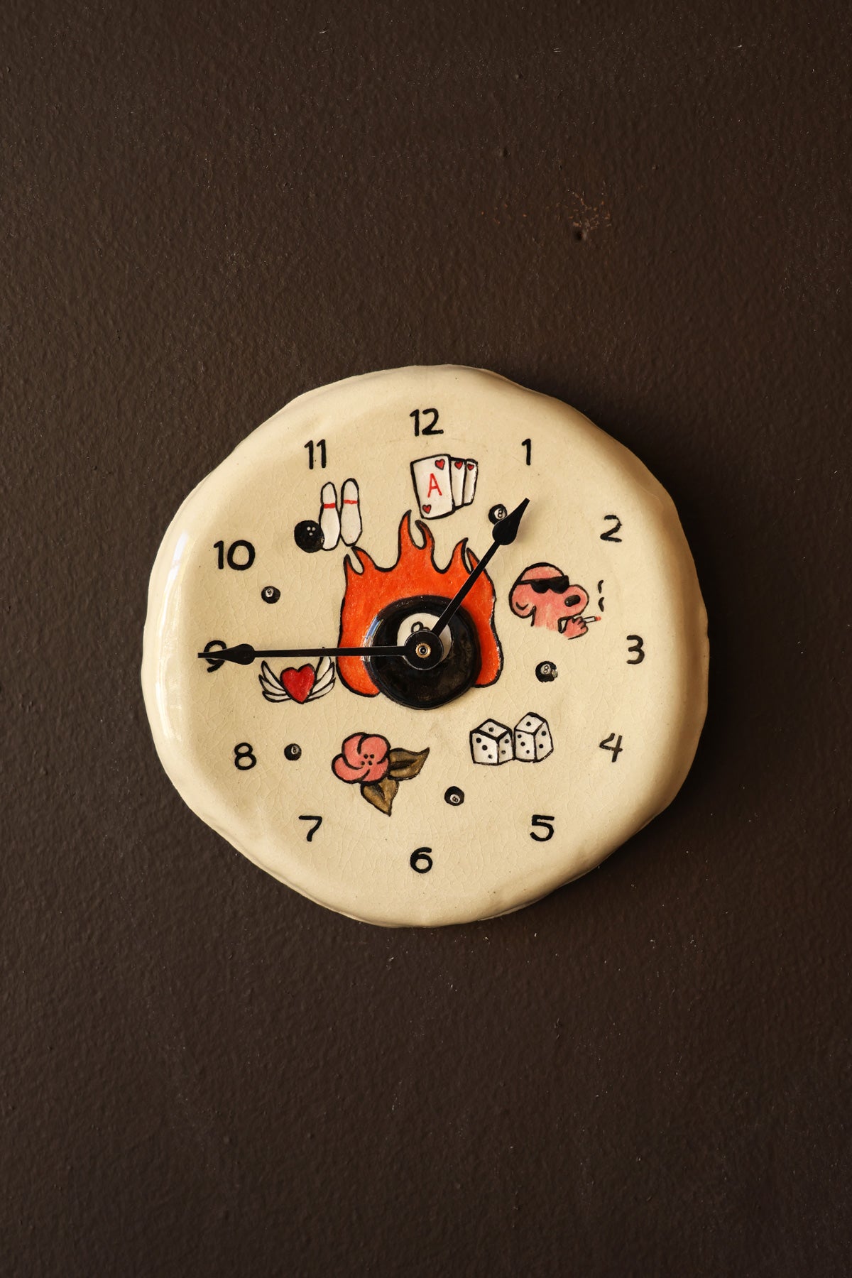 The 8 Ball Clock from Danny D’s Mud Shop mixes tattoo flash and barroom charm with a playful edge. Hand-painted flames, dice, and classic motifs circle the face, all set in Danny’s signature organic ceramic form. Each one has its own quirks in shape and color, making it a true one-off piece.