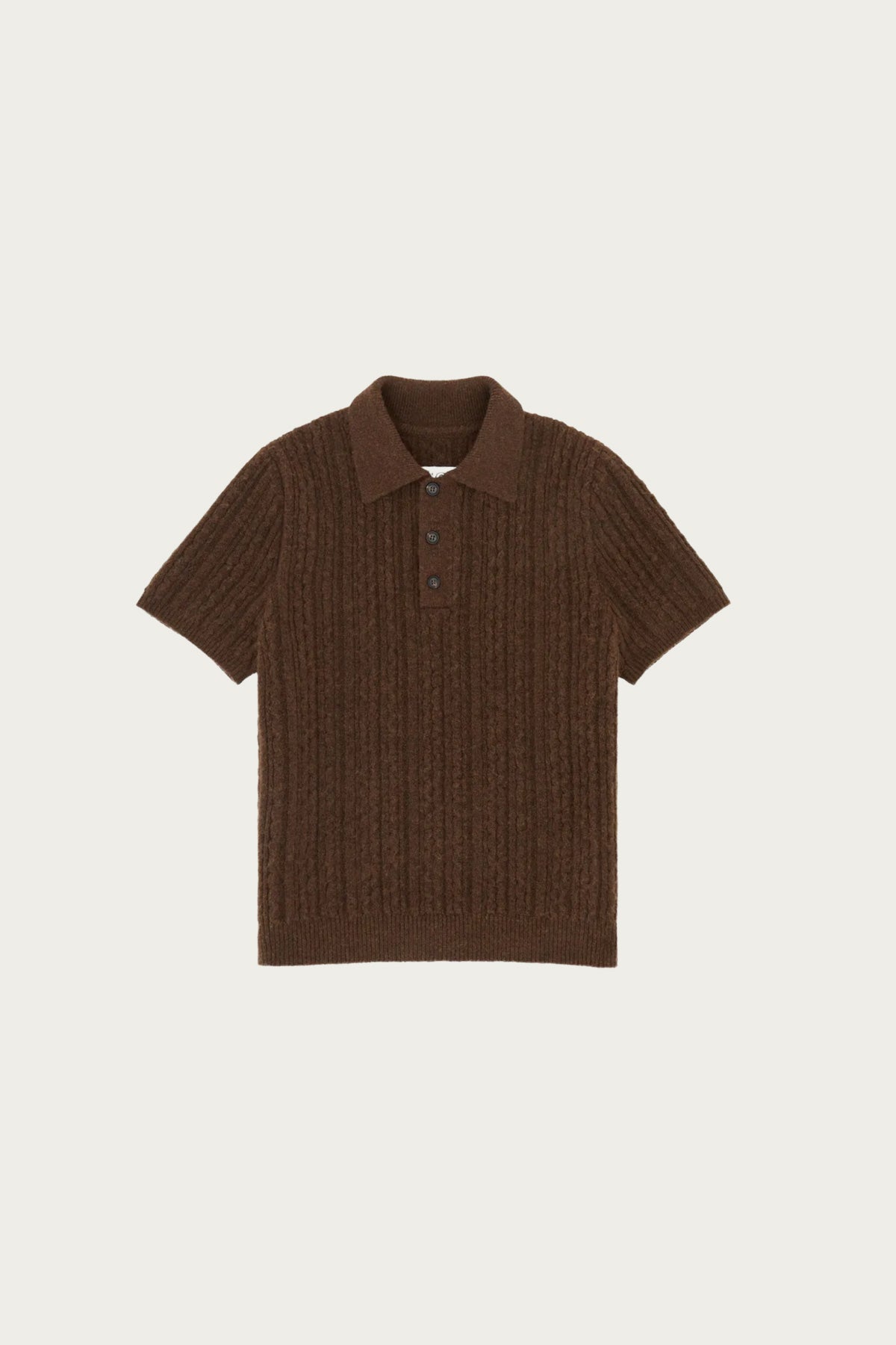 The MM6 Cable-Knit Polo Shirt reimagines a classic knit through the brand’s offbeat lens. Crafted in Italy from soft cotton-blend yarns, the piece balances structure and ease with its rich cable-knit texture and ribbed hem. A polo collar and short sleeves bring an elevated casual feel, while the warm brown tone grounds it as an easy layering piece across seasons. It’s refined and relaxed in equal measure-- signature MM6 understatement with quiet detail.