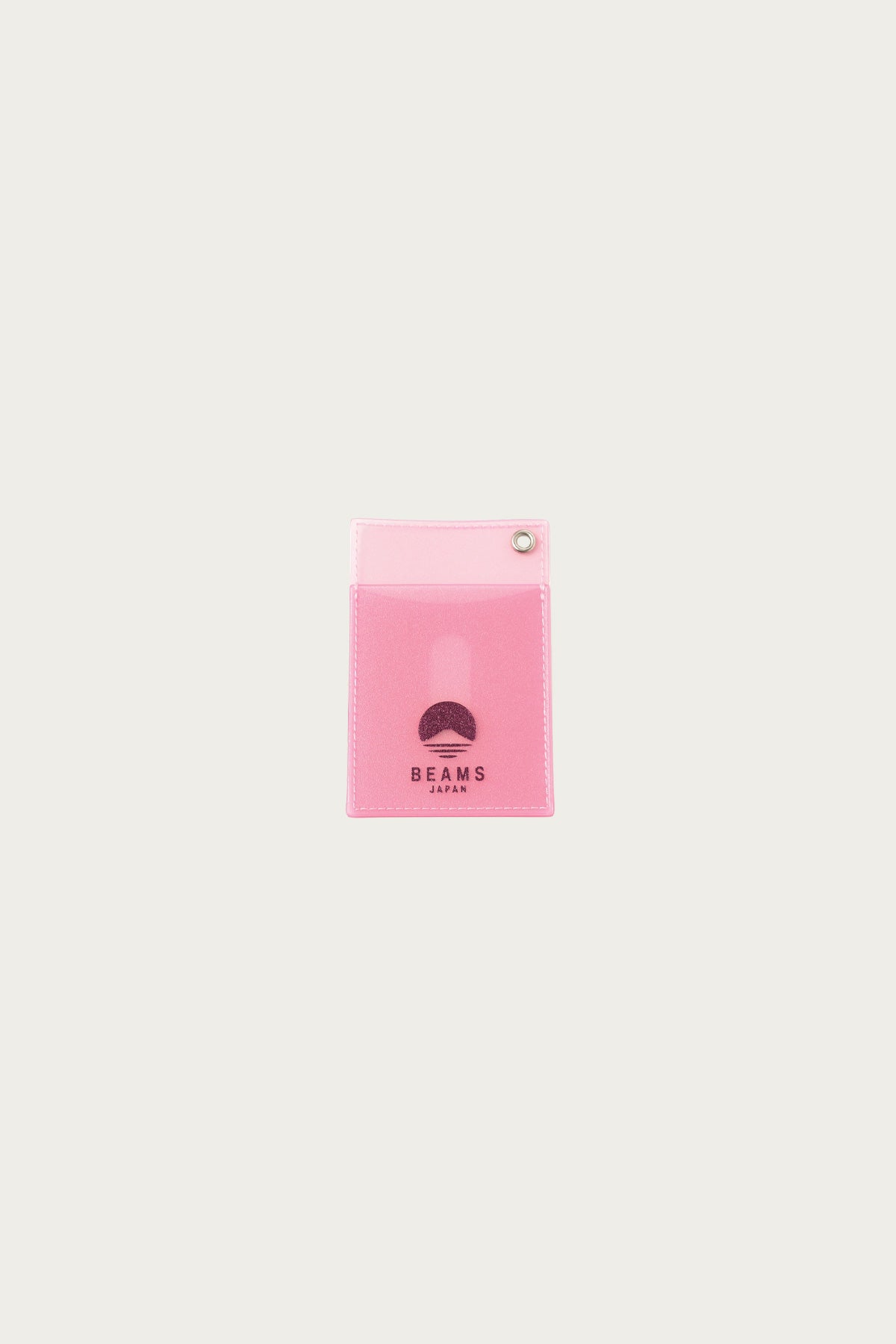 A translucent pink PVC card case with the Beams Japan logo printed in silver glitter. Soft, flexible, and waterproof.