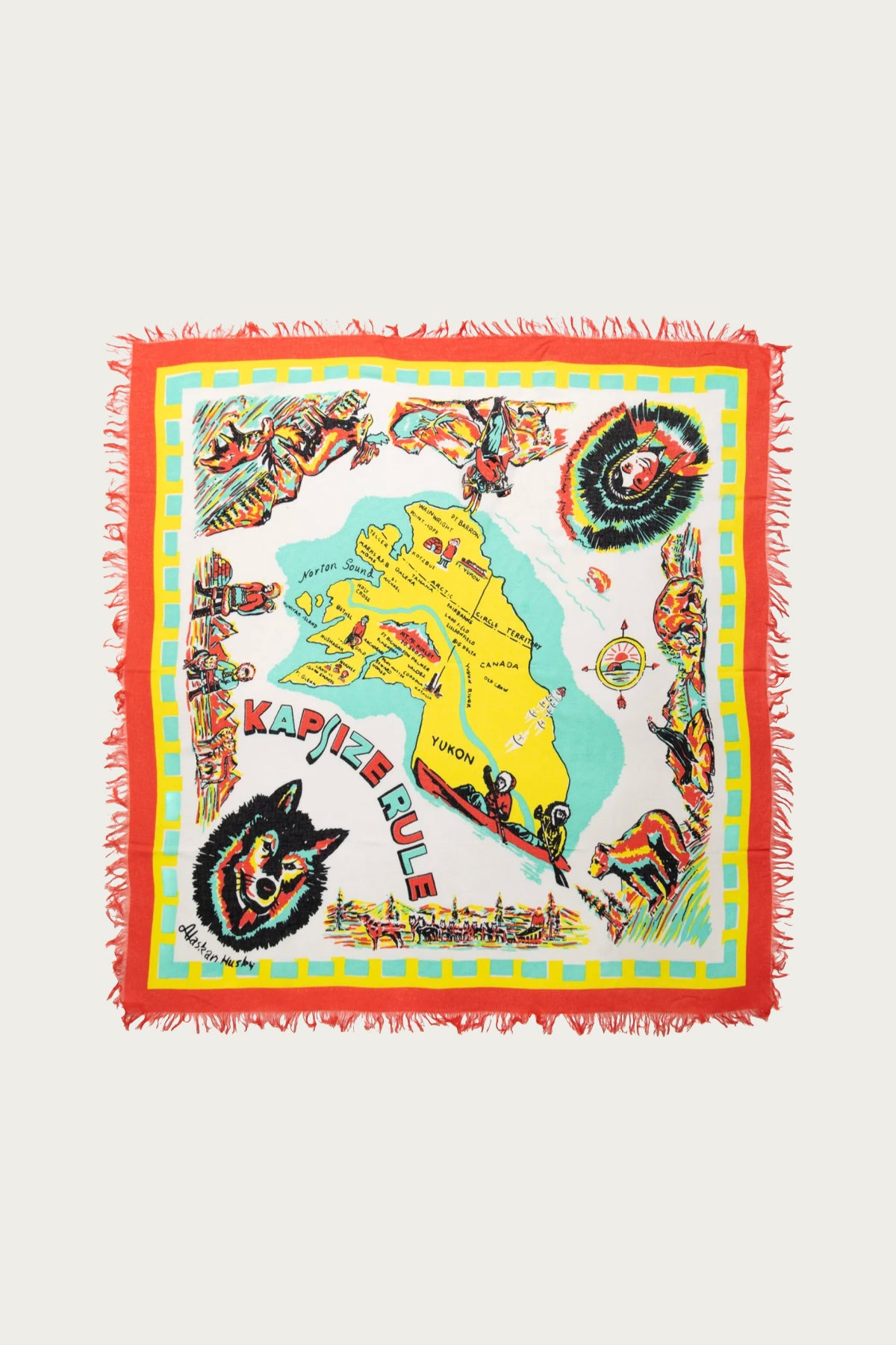 This stole feels like a storybook rendered in fabric. The printed Yukon map graphic is full of movement and color, framed by soft rayon and finished with fringe along the edges for extra motion. Lightweight but impactful, it drapes easily and adds personality without overwhelming an outfit.