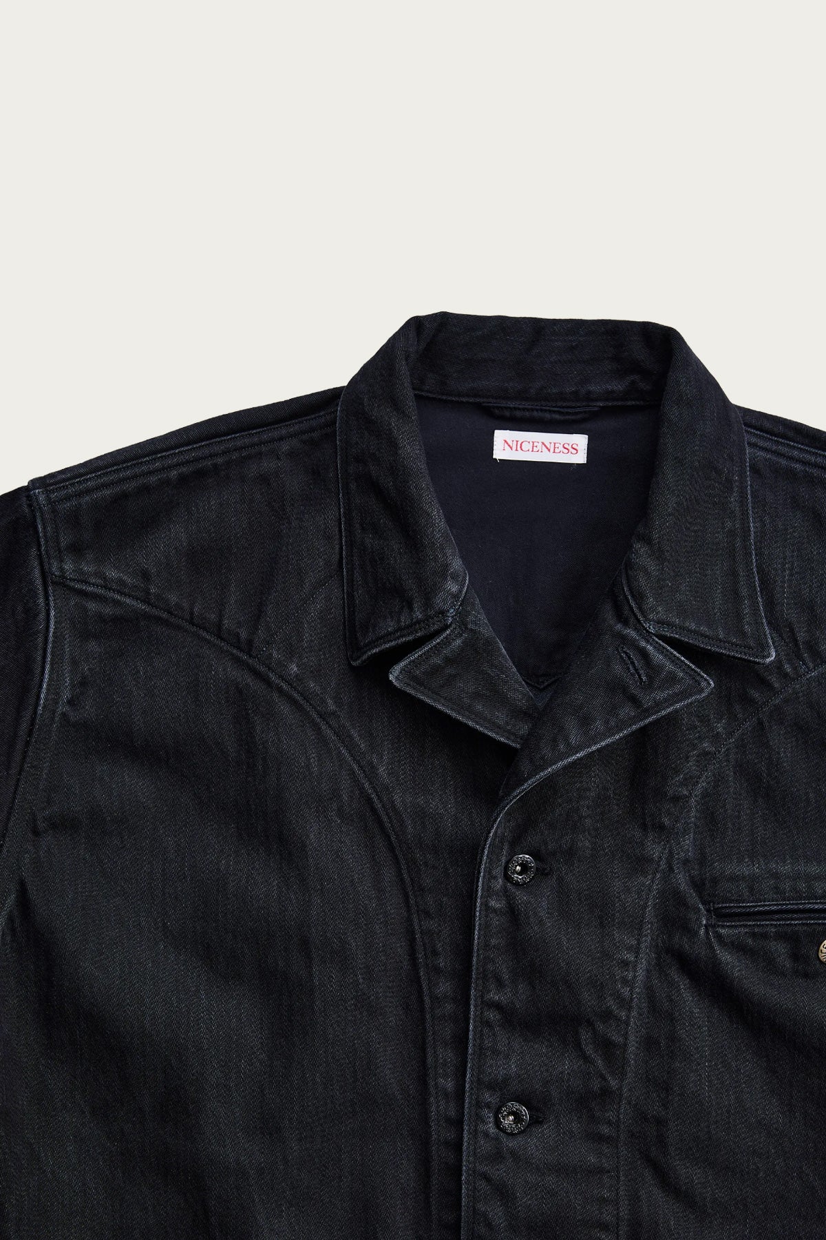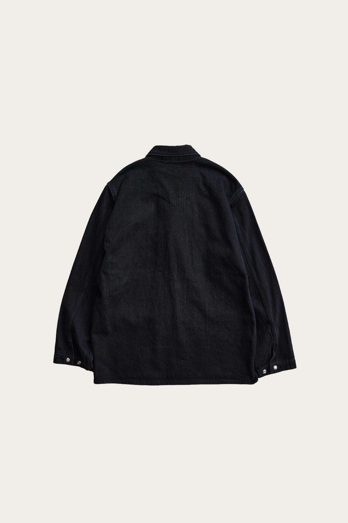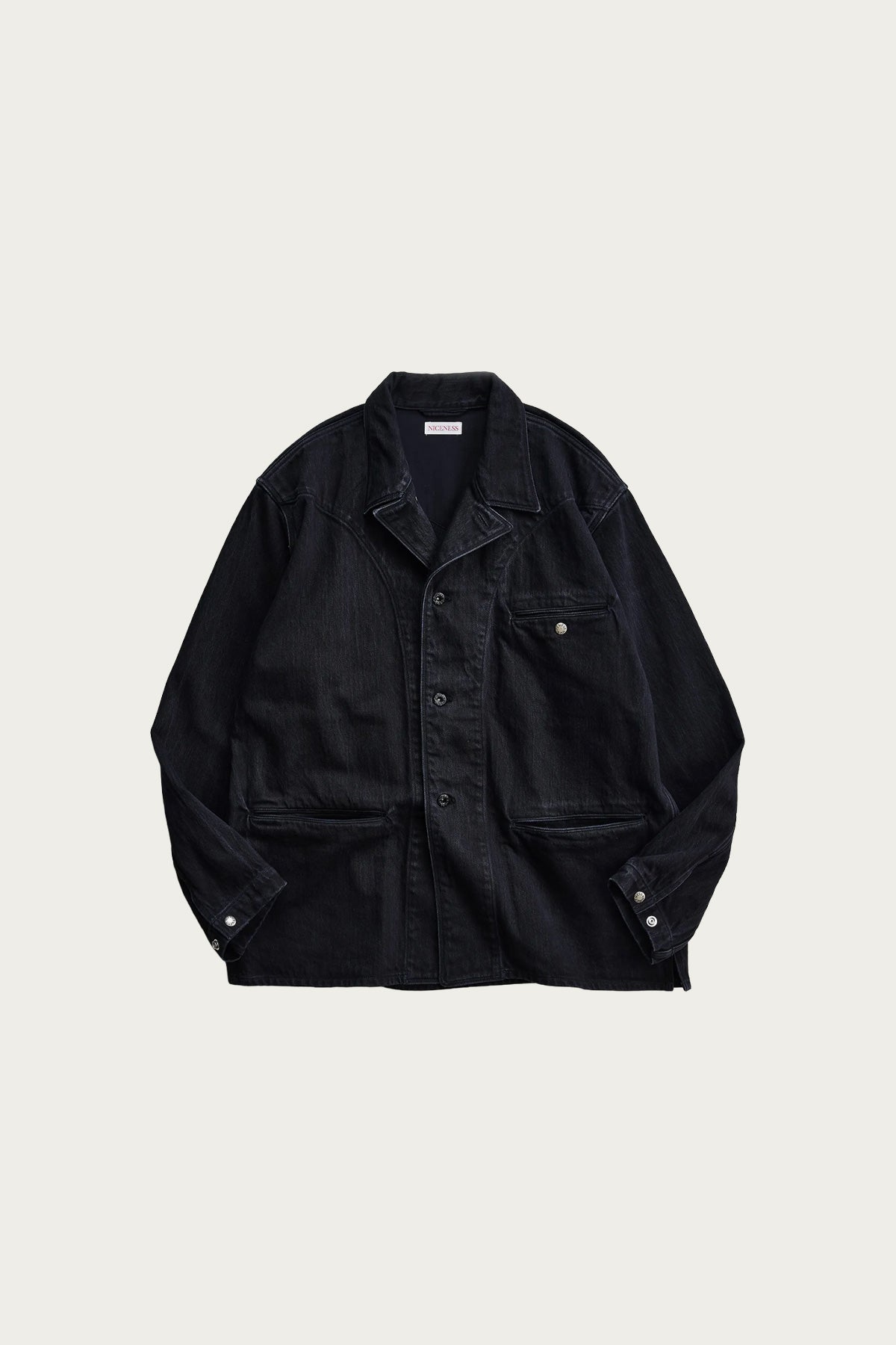 This utility jacket is crafted from bespoke yarn-dyed sulfur black satin, using sulfur rope-dyed yarn. Its denim-like faded look and extra-thick yarn create a rugged presence. The design references a 1950s US utility jacket, with the silhouette and construction updated for a modern look. It incorporates stitching reminiscent of a Western yoke and slit pockets seen in workwear from the 1920s to 1940s, creating a piece that blends nostalgia with modernity.