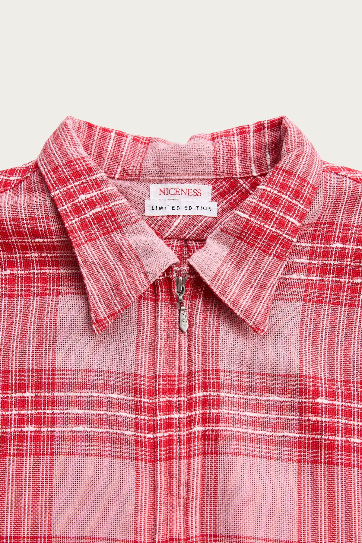 This long-zip pullover shirt is crafted from Italian deadstock fabric, combining high-strand, tightly twisted fine yarn with decorative yarn. The design references a 1940s dress shirt pattern, redesigned for a simple yet stylish look that can be worn casually. The fabric is woven with a slightly softer weave for increased breathability, giving it a distinctive vintage feel. It features a large kangaroo pocket, and when unzipped, can be worn like a blouson. It's difficult to create this type of fabric these days, making it a labor-intensive process, and you can enjoy the rare texture that only deadstock can offer.