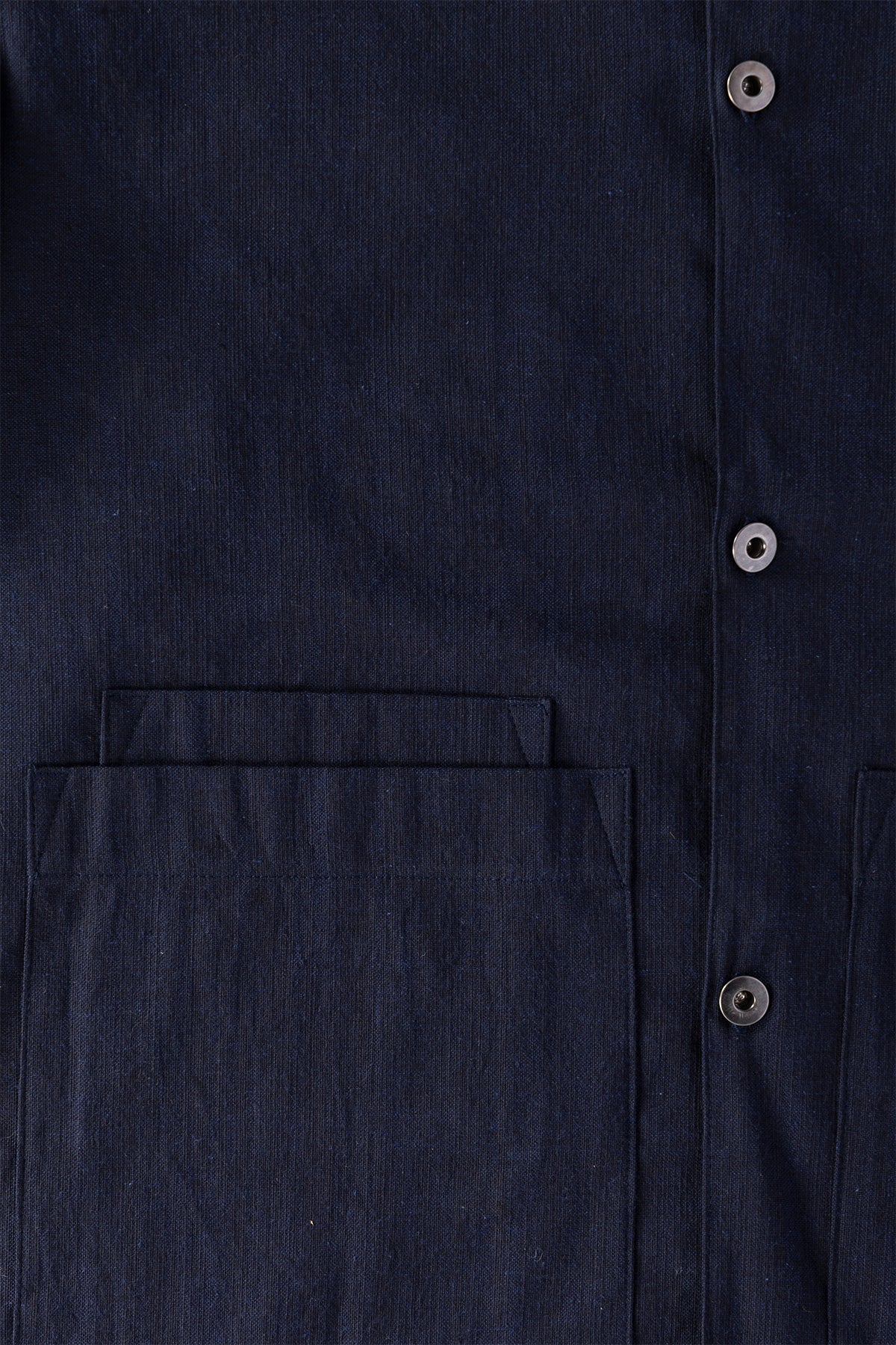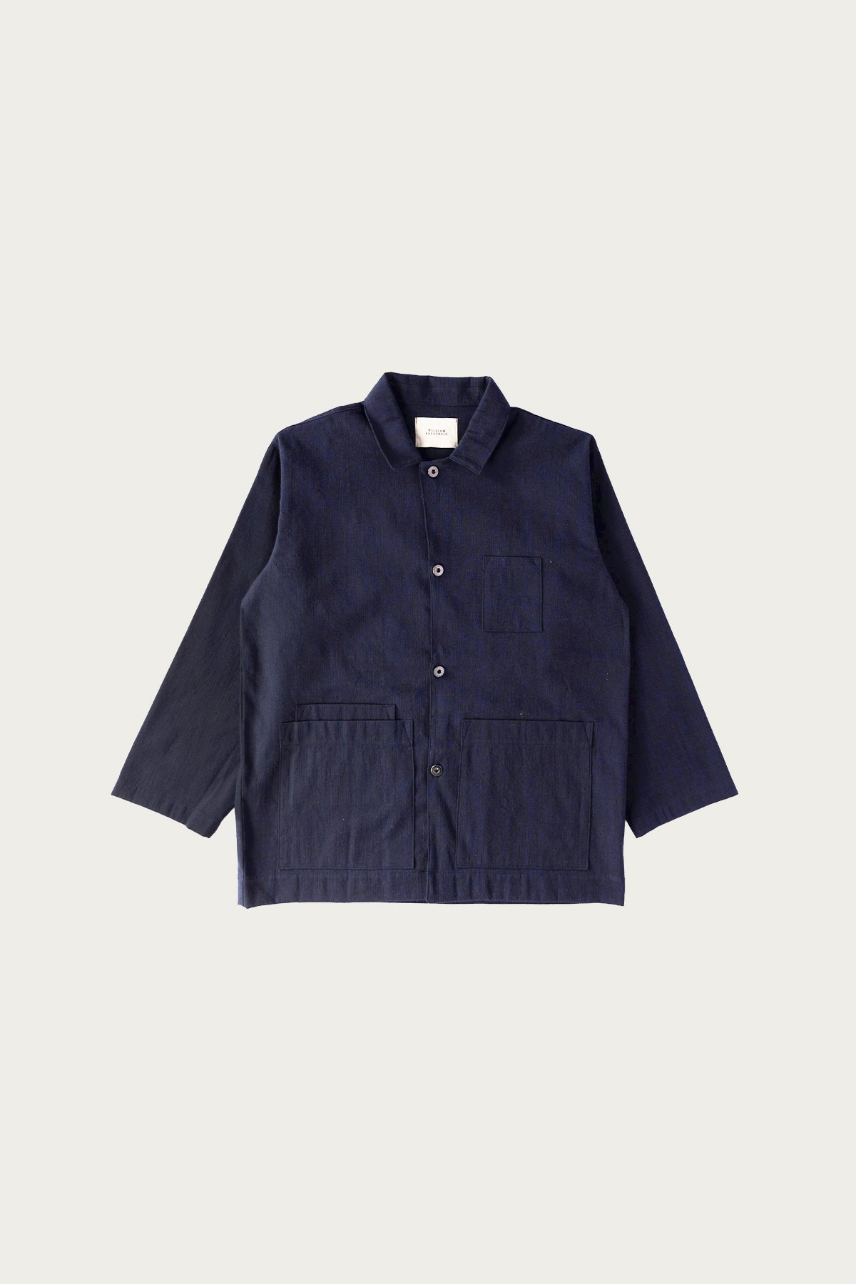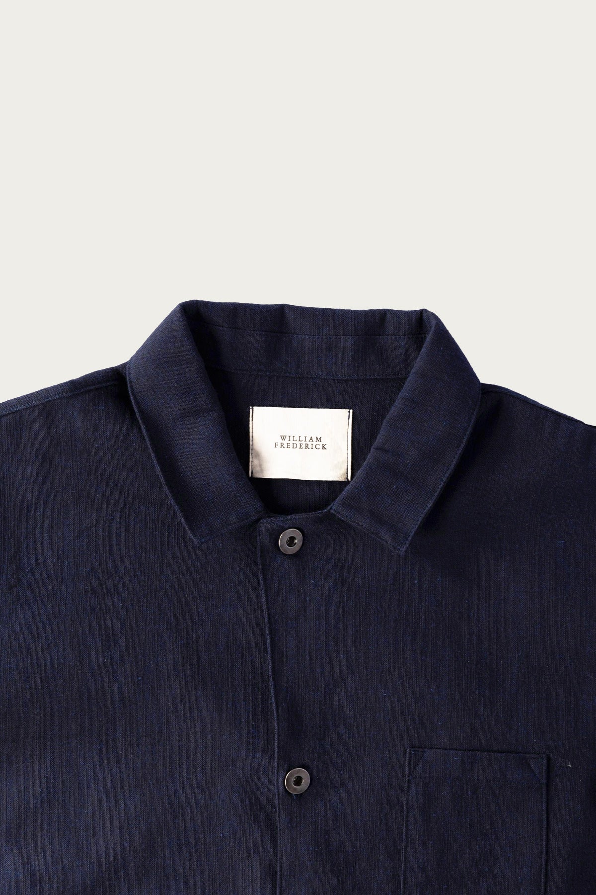 A clean and quietly considered studio jacket from William Frederick, built from a yarn dyed Japanese cotton that feels sturdy but still moves with ease. The fabric has a dry, structured hand and a deep inky tone that picks up light in a subtle way. The cut is relaxed with a slightly boxy shape that layers well, and the four pocket layout keeps the spirit of a classic workshop coat while staying refined enough for everyday wear. Finished with donut metal shank buttons that nod to old workwear hardware and brought to life in Cleveland in small batches. This one is exclusive to Canoe Club.