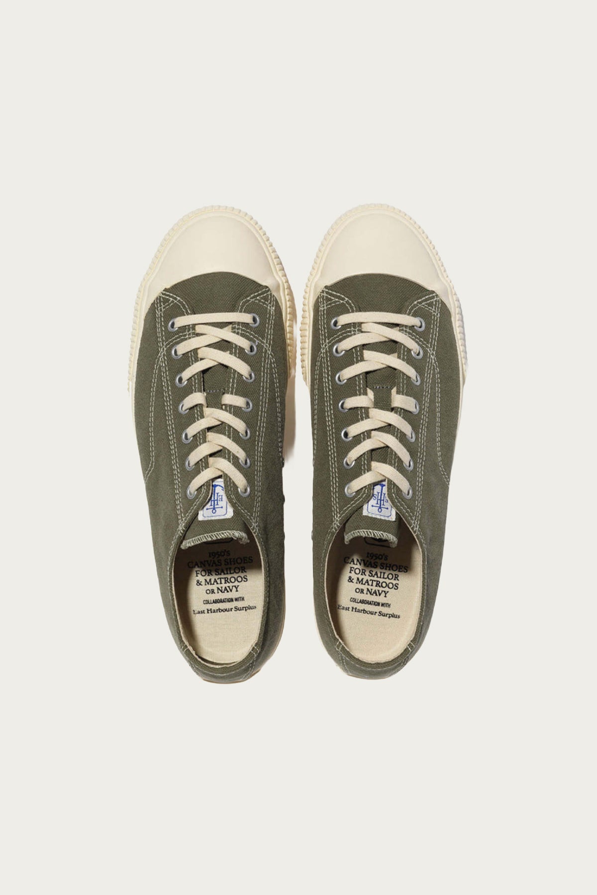 A clean canvas sneaker with just enough character. The M-01 in Olive leans into simplicity, built with a textured cotton upper, contrast stitching, and a substantial rubber toe cap and outsole that nod to vintage court shoes.