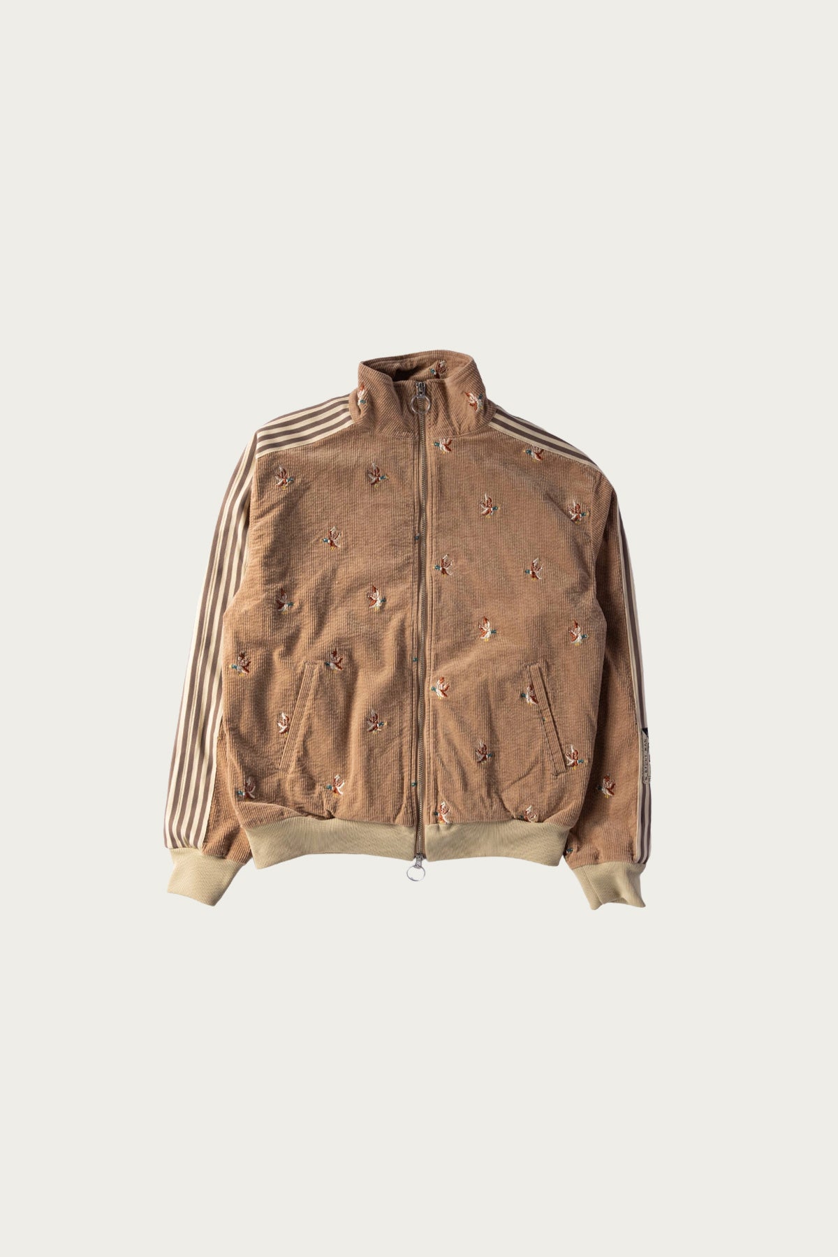 Kapital reimagines the classic track jacket through their unmistakable lens, blending sport nostalgia with playful craftsmanship. Cut from a soft eleven wale stretch corduroy, the jacket has a warm hand and an easy drape that feels instantly broken in. The surface is covered with Kapital’s duck embroidery, each one slightly imperfect in the best way, giving the piece personality without going over the top.