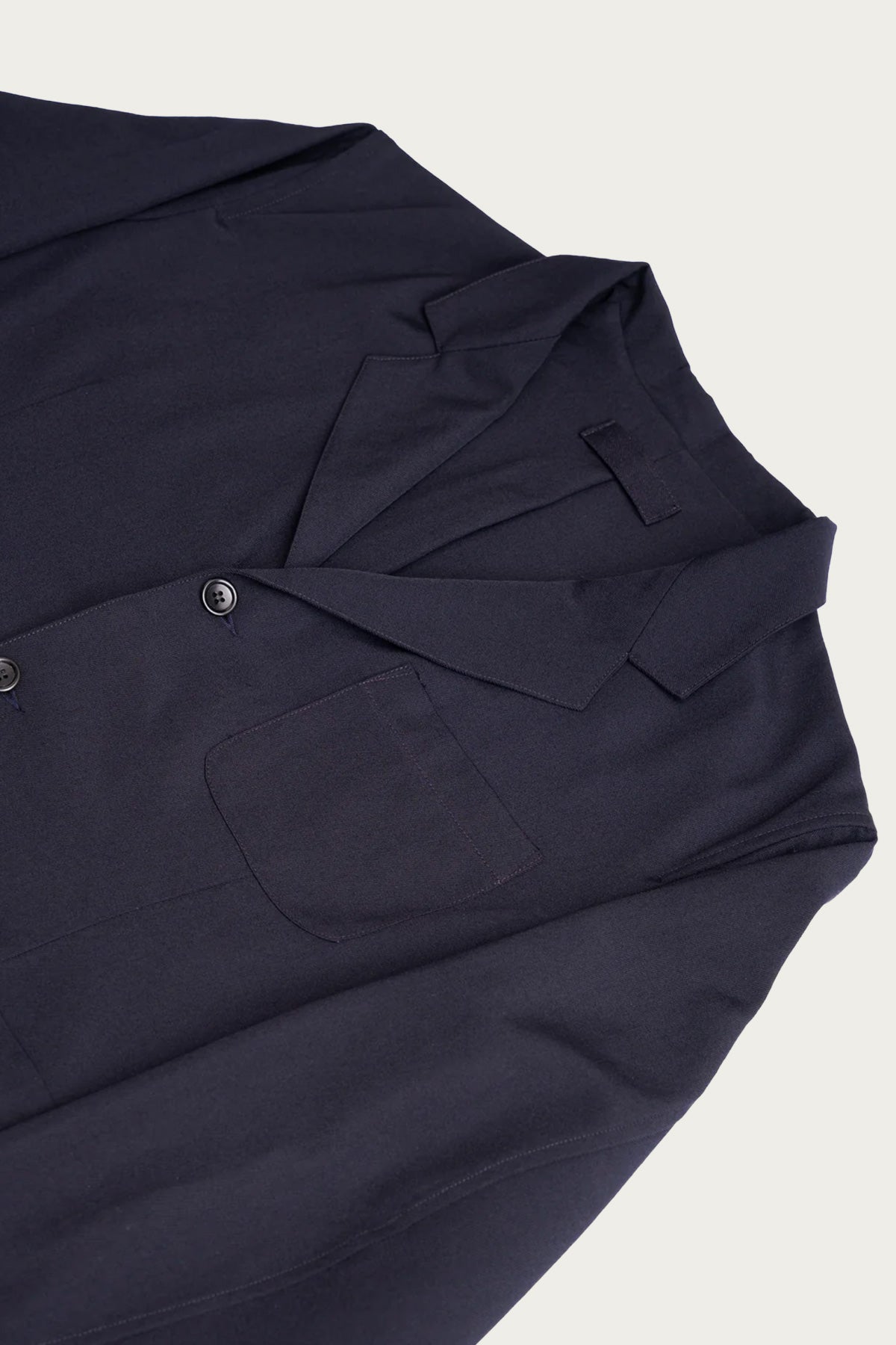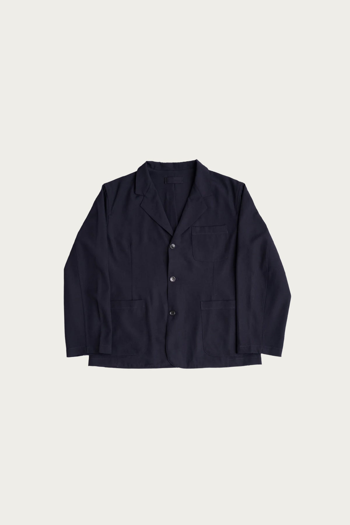 The Carry On Jacket is an unfussy, unlined three button suit jacket cut from a dry, crisp, and densely woven midweight wool gabardine sourced from a legendary mill in the Chūbu region of Japan. The fabric holds a clean line while still allowing an easy, natural drape. A curved two piece sleeve brings a touch of structure without interrupting the relaxed feel. Interior seams are flat felled for long lasting durability and a tidy finish, with the armhole seam neatly piped. The jacket features three patch pockets, a plain cuff, notched lapels, and dyed corozo buttons.