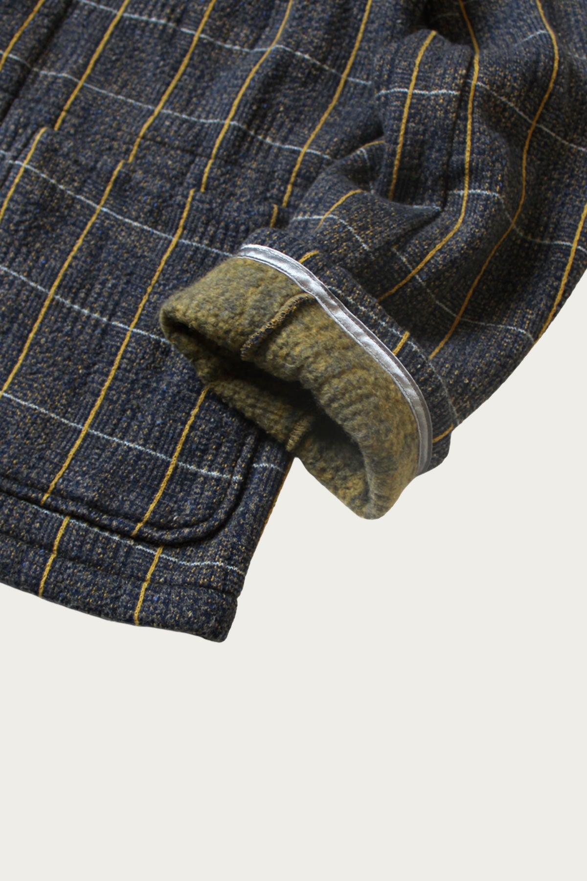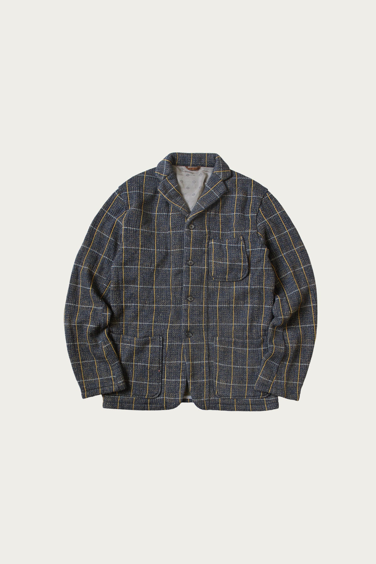 A jacket that blurs the line between cozy and tailored. The tweed style fleece fabric brings texture and warmth, while the structured shape and button front give it a jacket-like presence. The subtle grid pattern in gray and yellow adds depth without feeling busy.