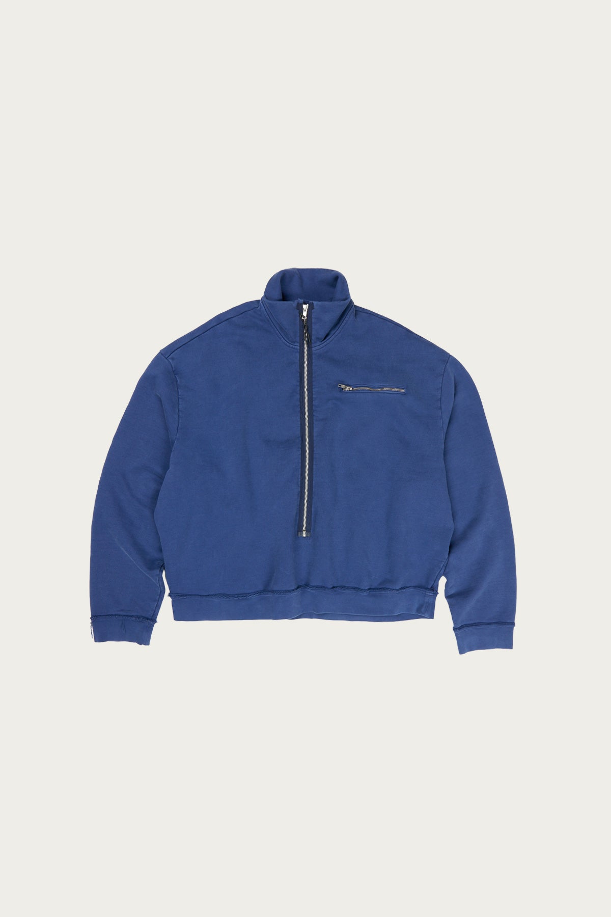 A familiar sweatshirt shape with added weight and structure. The heavy jersey gives it presence, while the half zip and chest pocket shift it slightly away from the standard. Cropped and boxy with raw finishing throughout.