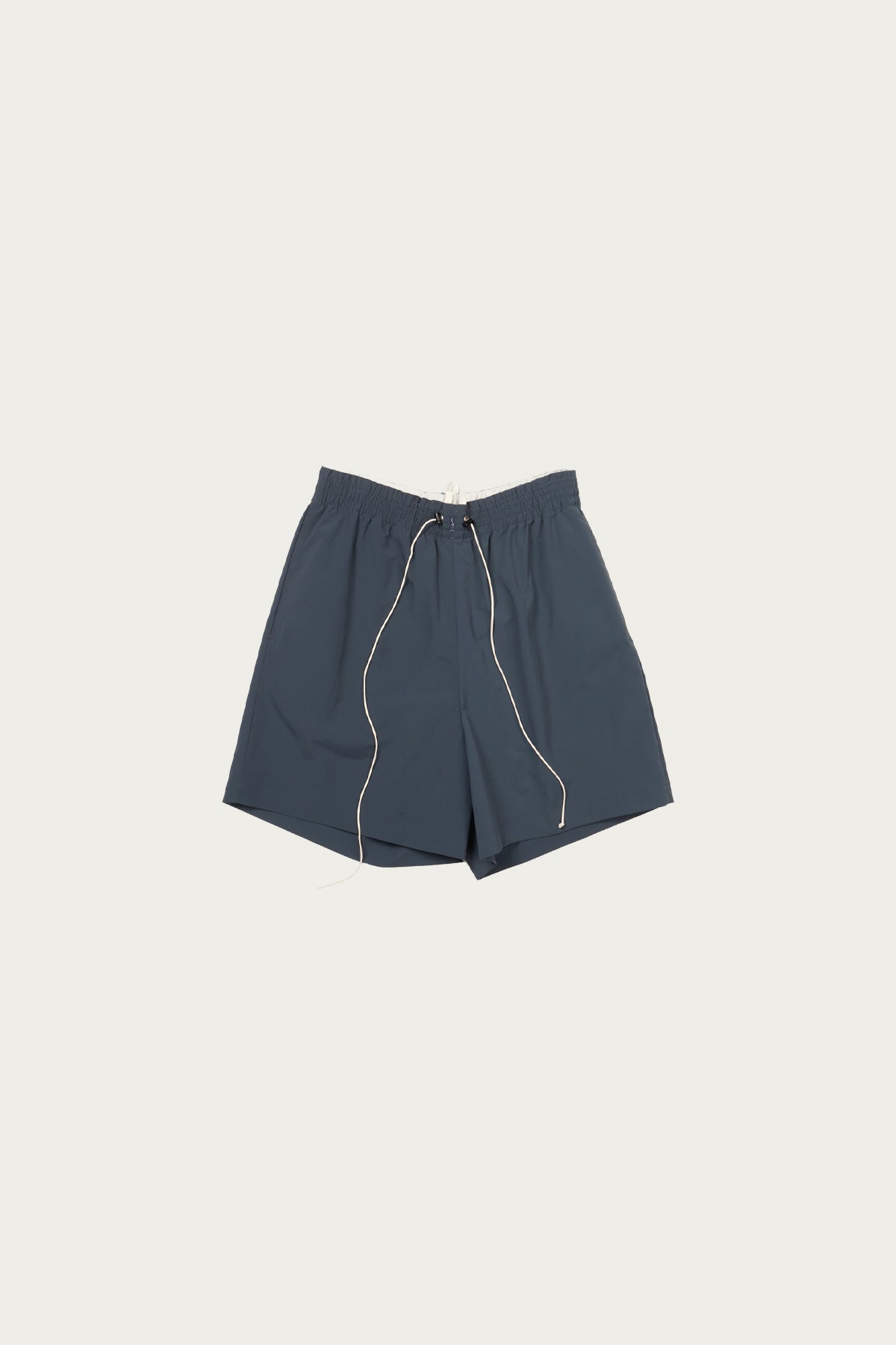 Relaxed shorts cut to sit just at the knee. The lightweight fabric moves easily, with an elastic waistband and extended drawcord adding a casual, slightly exaggerated detail.