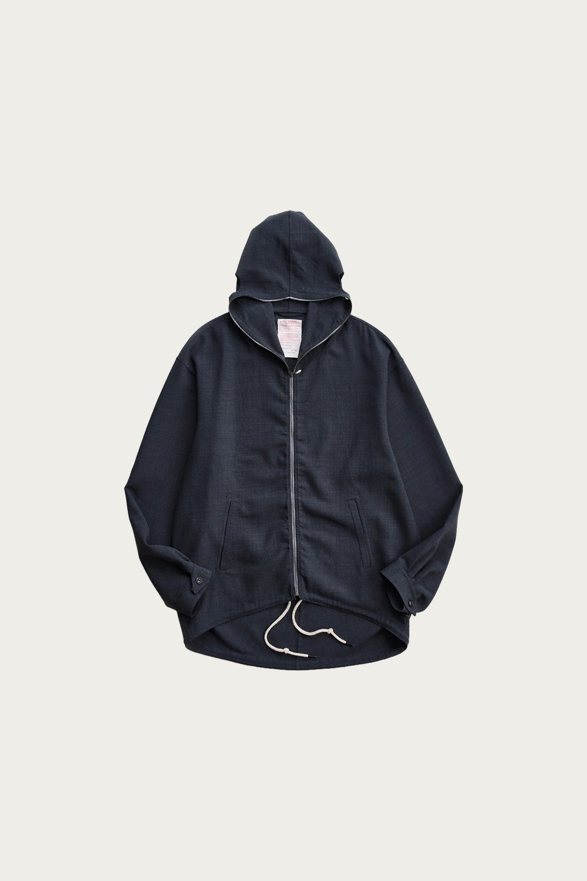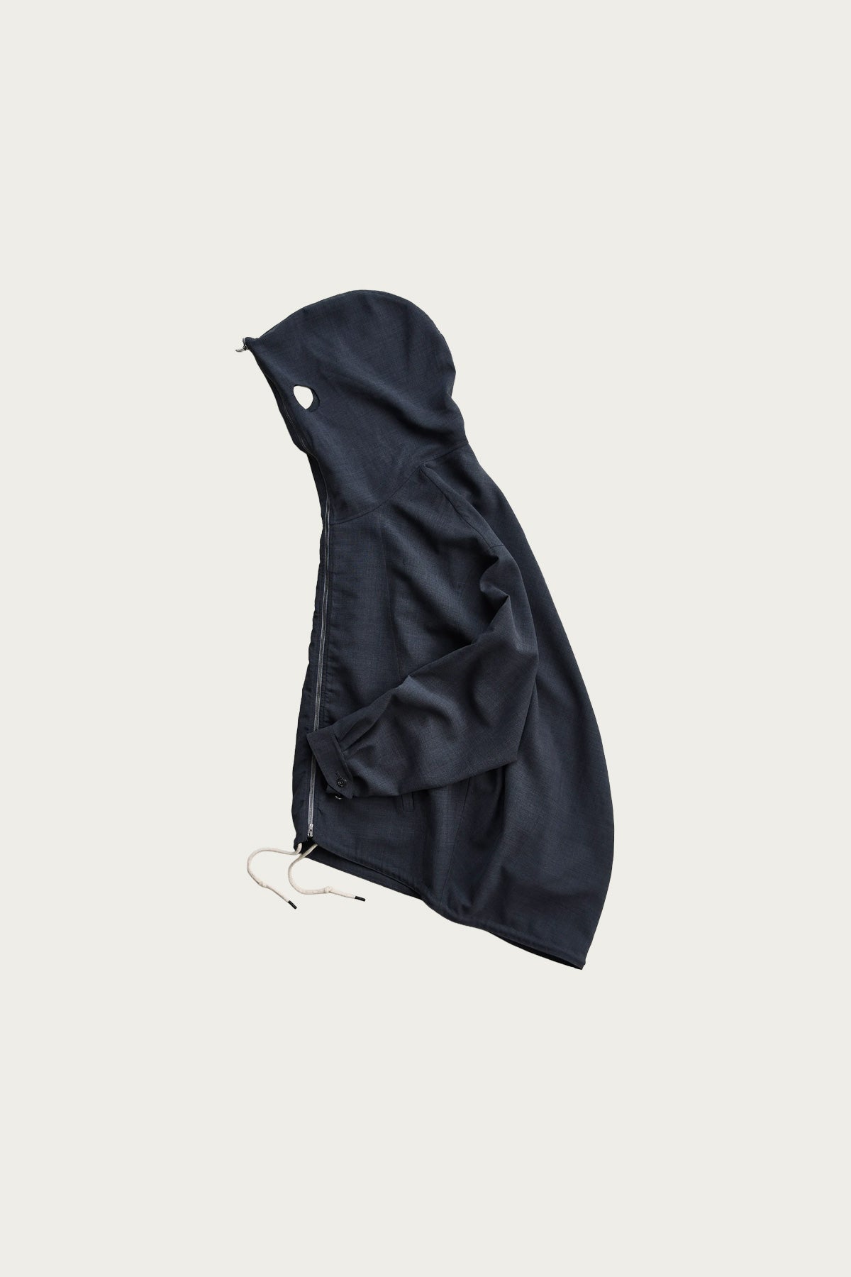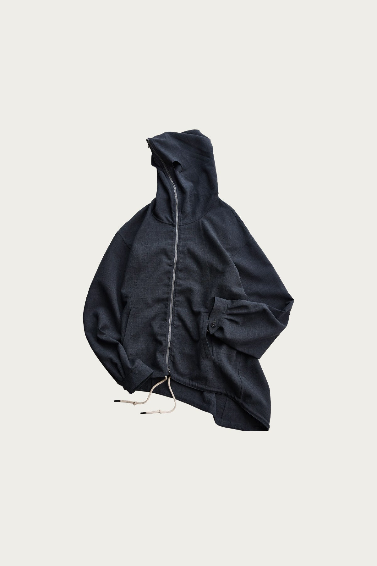 This zip-up hoodie is crafted from a fabric woven with ultra-fine sirospun polyester/wool yarn in a plain double weave. It references sports sweatshirts from the 1960s and 1970s, and incorporates elements of dress, couture, and '90s street culture. The double weave provides just the right amount of volume and allows for flexible stretch in both directions, creating a comfortable fit and a flattering silhouette. The tweezers are used for the reversible stitching, resulting in a clean finish on both the front and back. The result is a unique blend of sportswear, dress, and streetwear styles.