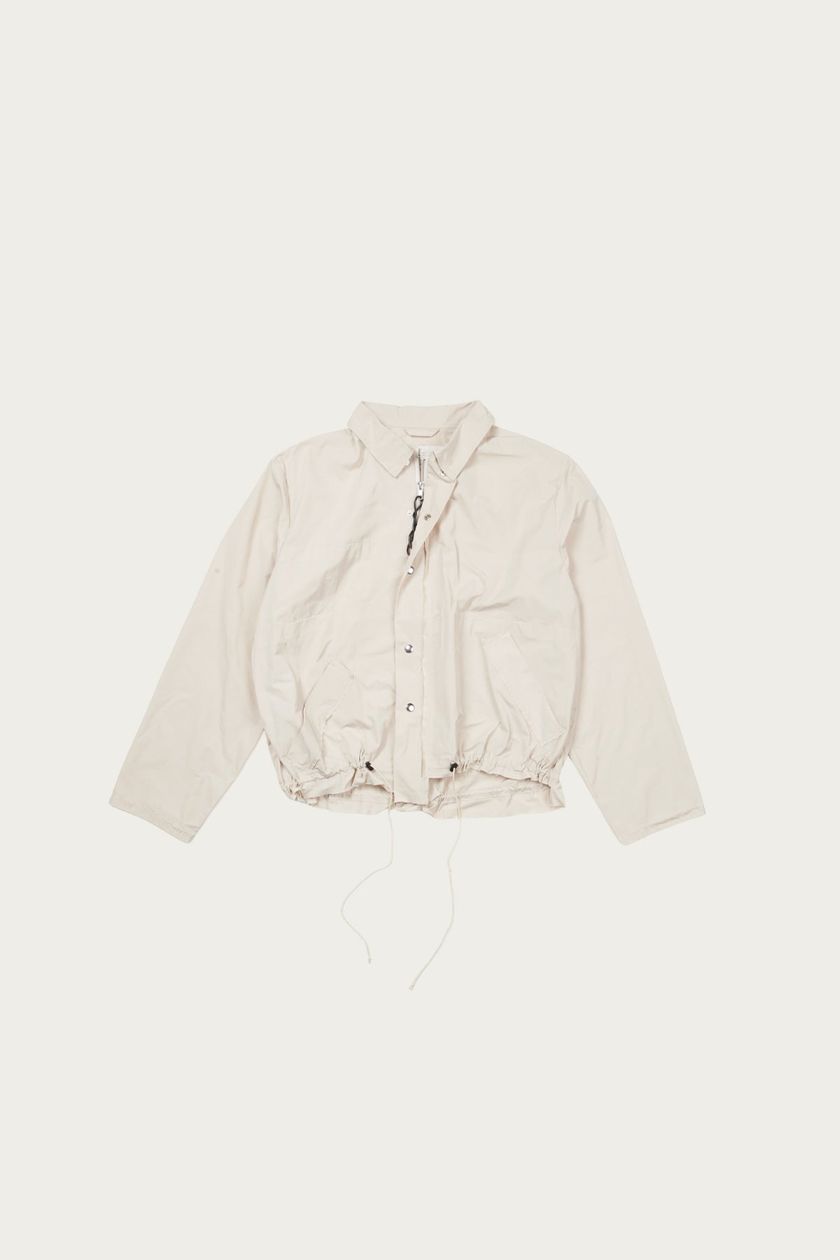 A clean, cropped silhouette softened by a light sand tone. Cut from a smooth technical twill, it holds its shape while remaining easy and fluid. Snap front closure and drawcord hem bring subtle adjustability, with a slightly off balance feel that keeps it from being too straightforward.