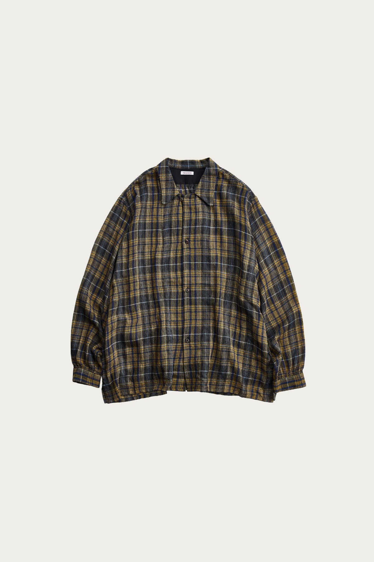 This open-collar jacket shirt is crafted from a multicolored ombré check fabric, made with high-quality, ultra-fine wool yarn in eight vertical and five horizontal colors for a total of 13 colors. The design is somewhere between a jacket and a shirt, and thanks to the handcrafted craftsmanship and meticulous design unique to India, it can be worn in a variety of situations. The fabric was created with the aim of evoking the atmosphere of good old America in the 1920s and 1930s. The stitching is also done by hand, with hand-applied chain stitching to gather the details and create a three-dimensional look.