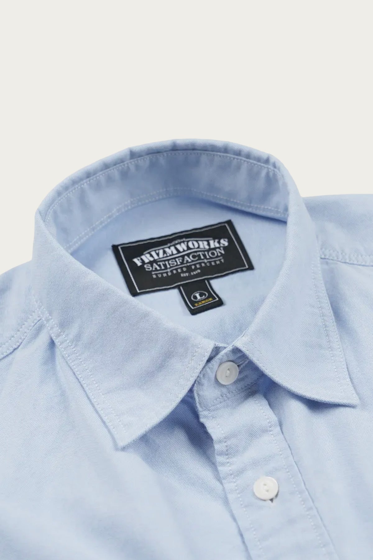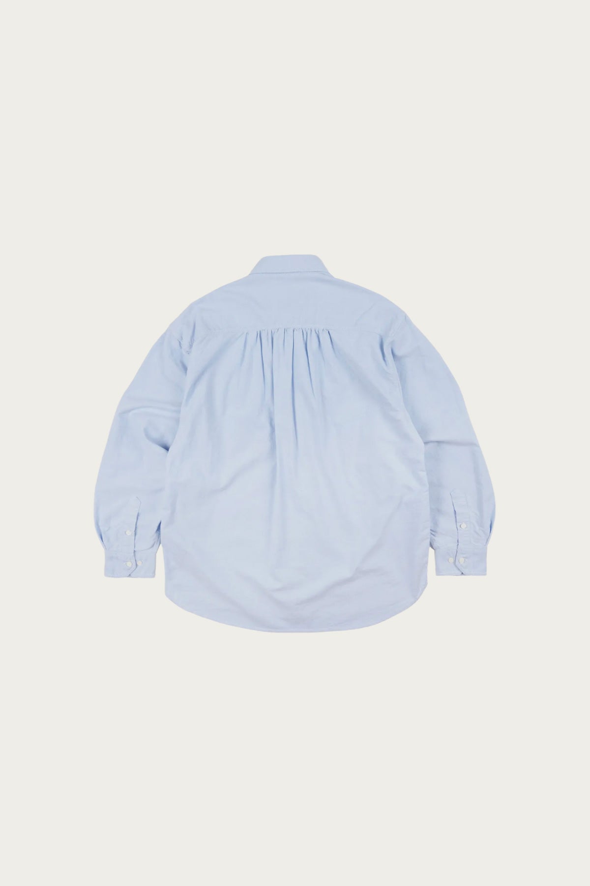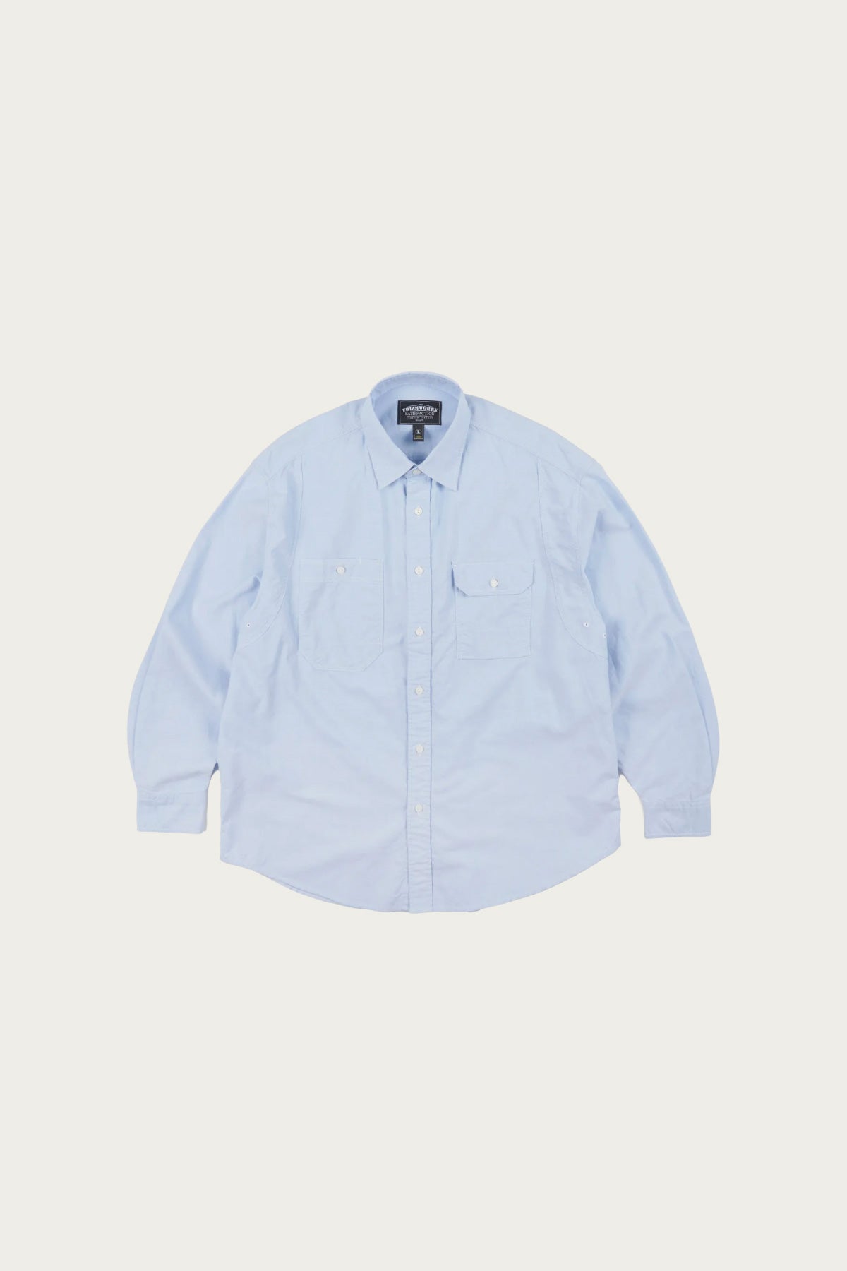 A heritage inspired work shirt cut from sturdy oxford cloth in a light blue tone. Features symmetrical chest pockets with button closures and a clean, structured collar that references early American workwear.