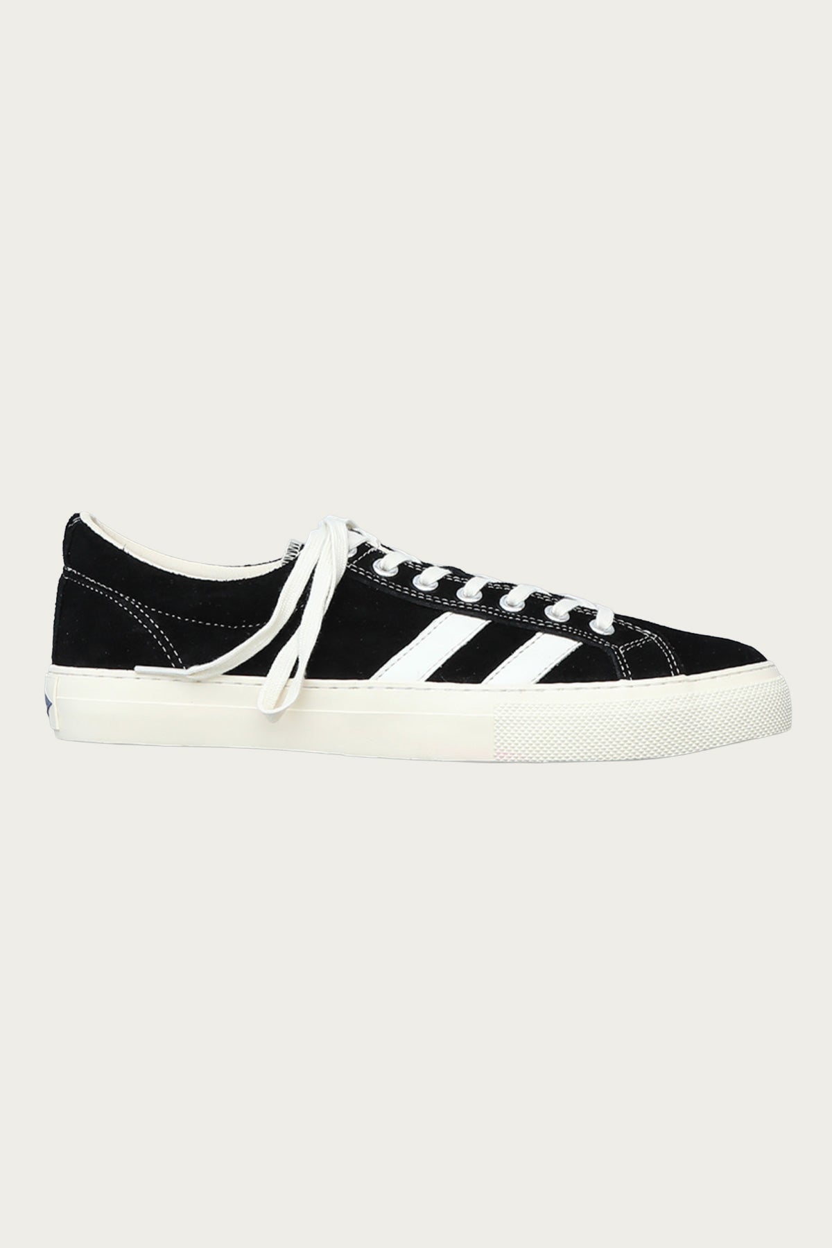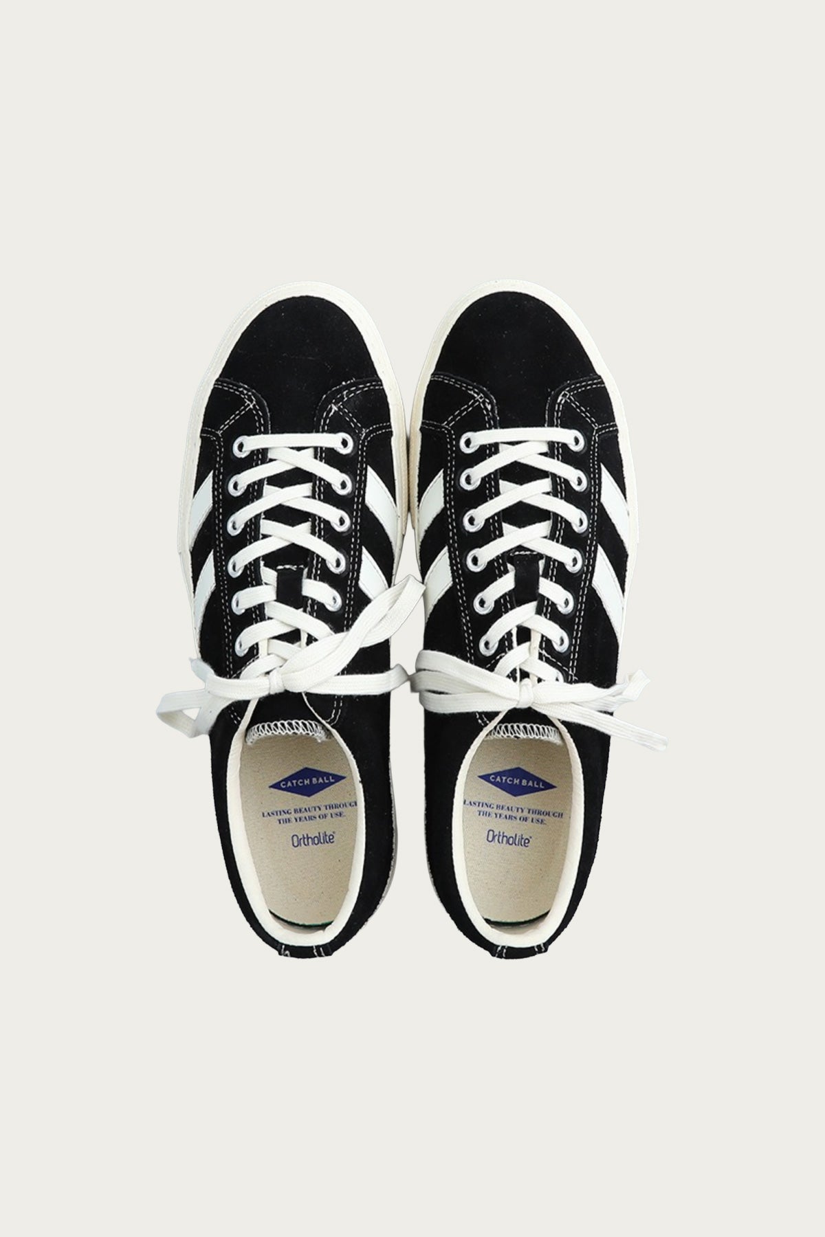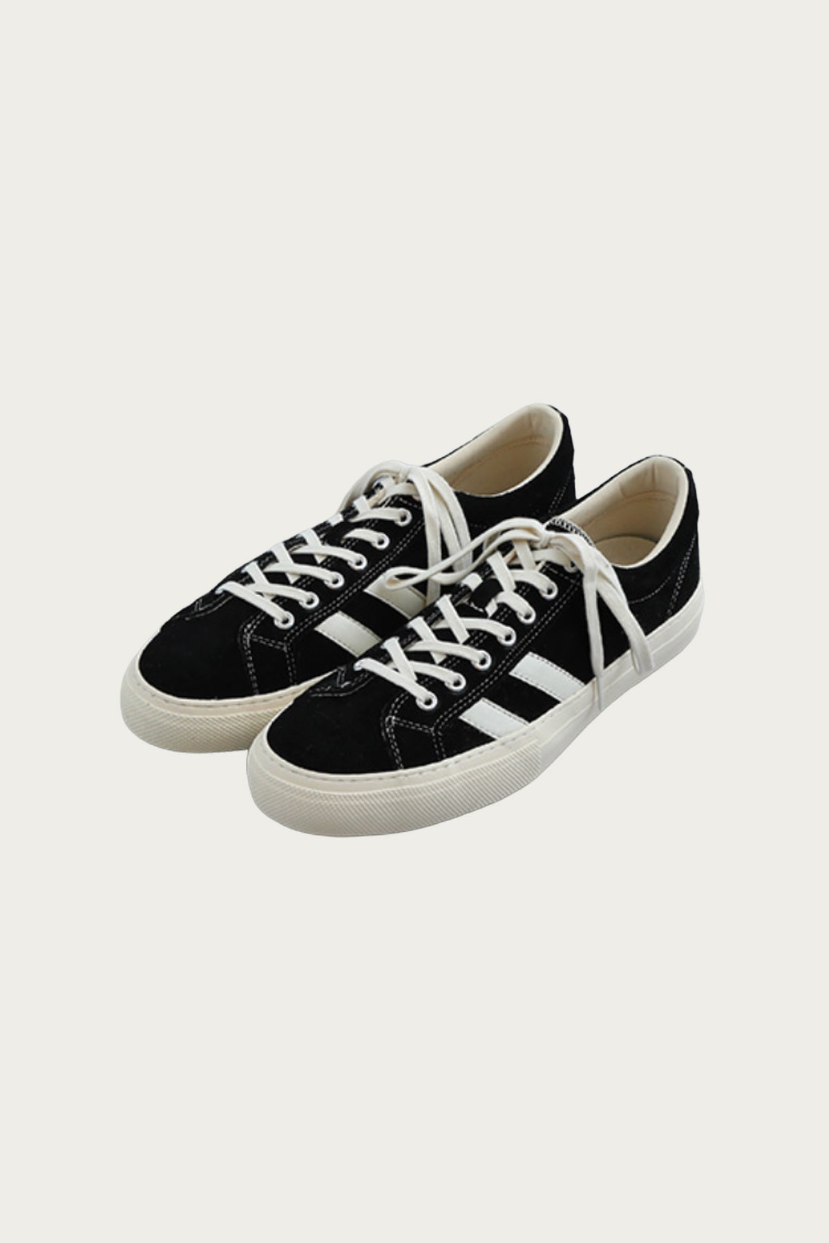 Catch Ball’s take on a striped heritage sport shoe. The B-02 in black suede has a more graphic look with angled white leather stripes and a slightly chunkier midsole. Still lightweight, still easy to wear, but a little more statement-making.