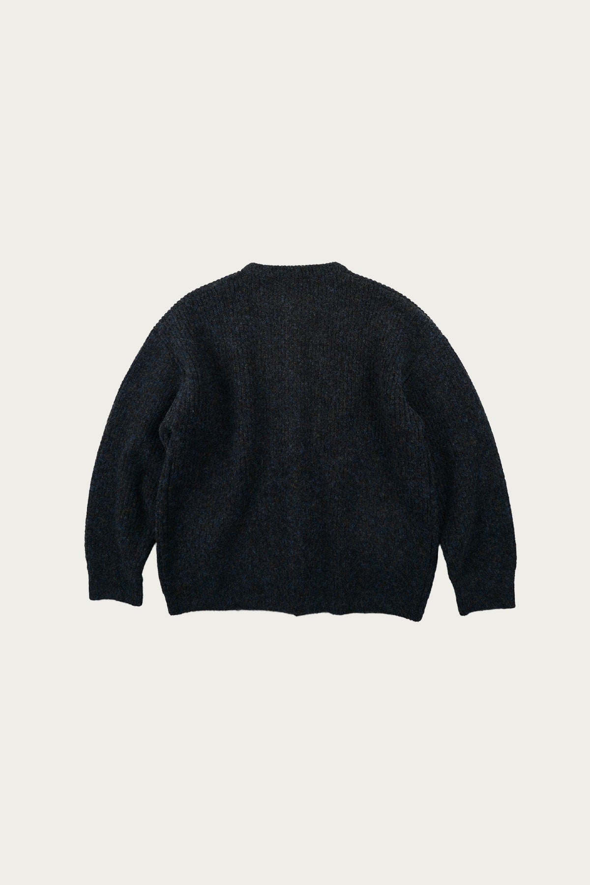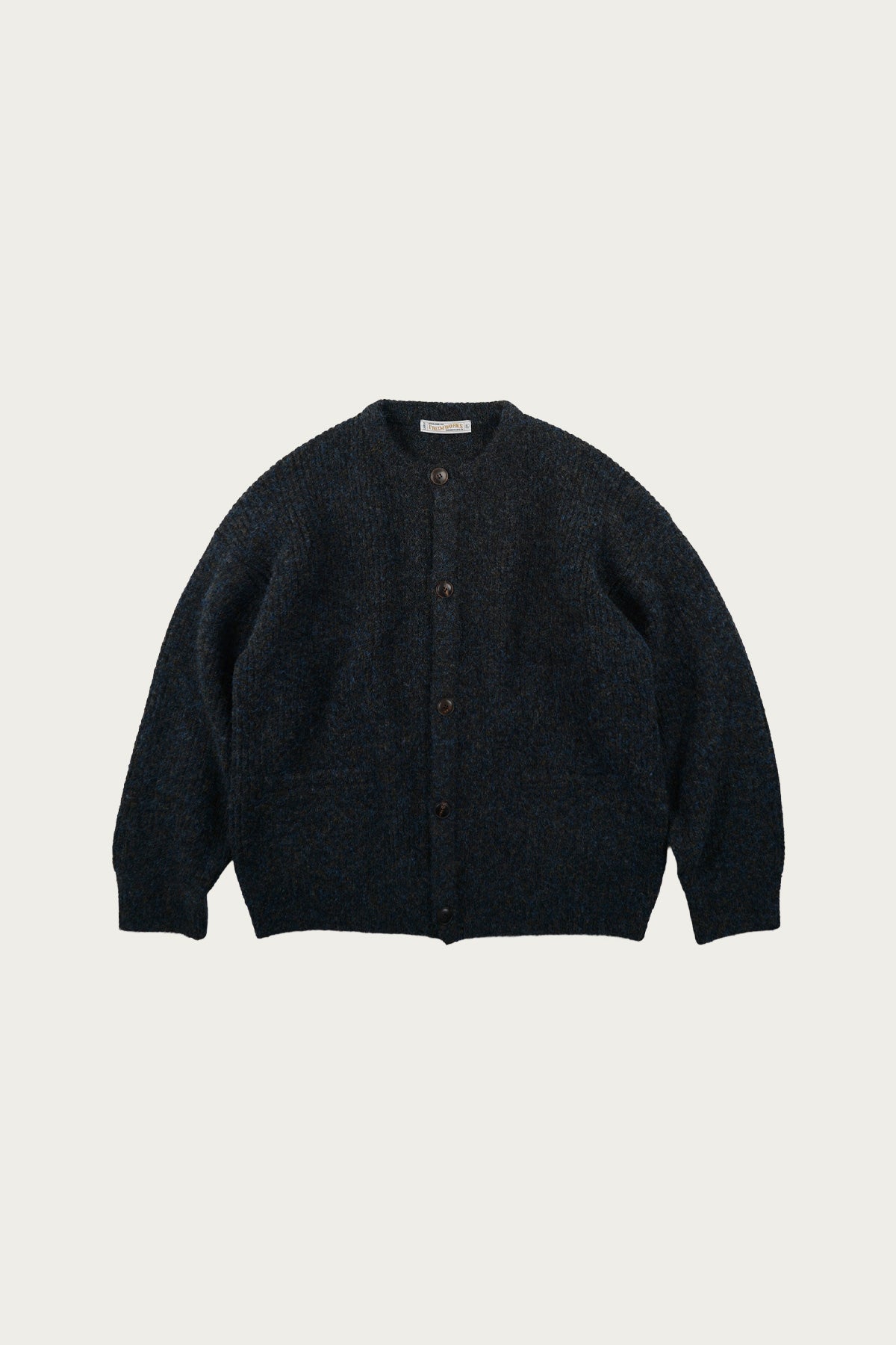 A warm and textured cardigan built with soft brushed wool for a vintage inspired hand feel. Frizmworks shapes this piece with an easy, slightly relaxed silhouette that layers comfortably without feeling bulky. The knit surface has a subtle heather that brings depth to the color, and the front pockets add a touch of utility. Finished with tonal buttons and a classic crew neckline, it is a simple everyday layer with a lot of character.
