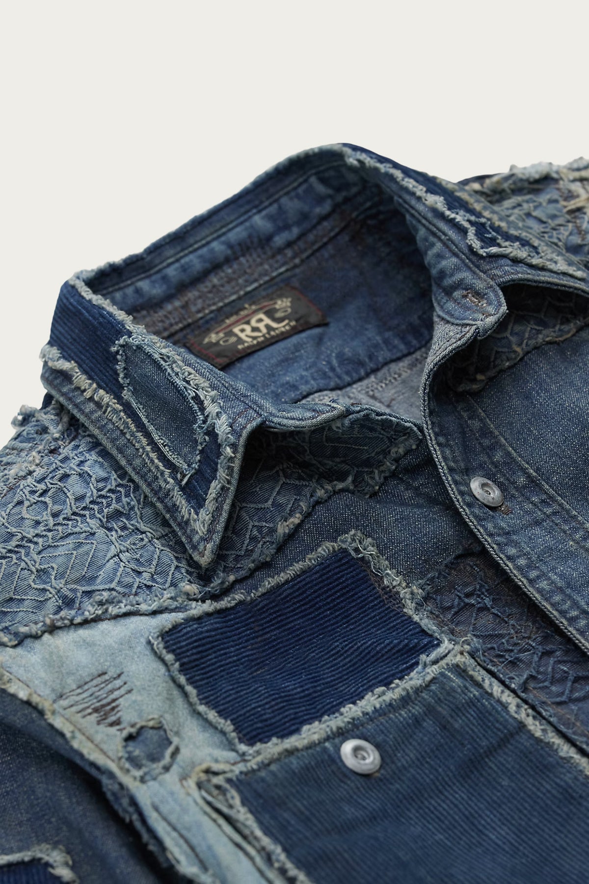 A gallery of denim history stitched into one standout shirt. RRL layers together hand distressed indigo patches, textured panels, and worn in detailing that gives the piece the feel of something rescued from an old workbench. The fit is easy, relaxed, and built for real use. It is the kind of shirt that looks better every time you throw it on.