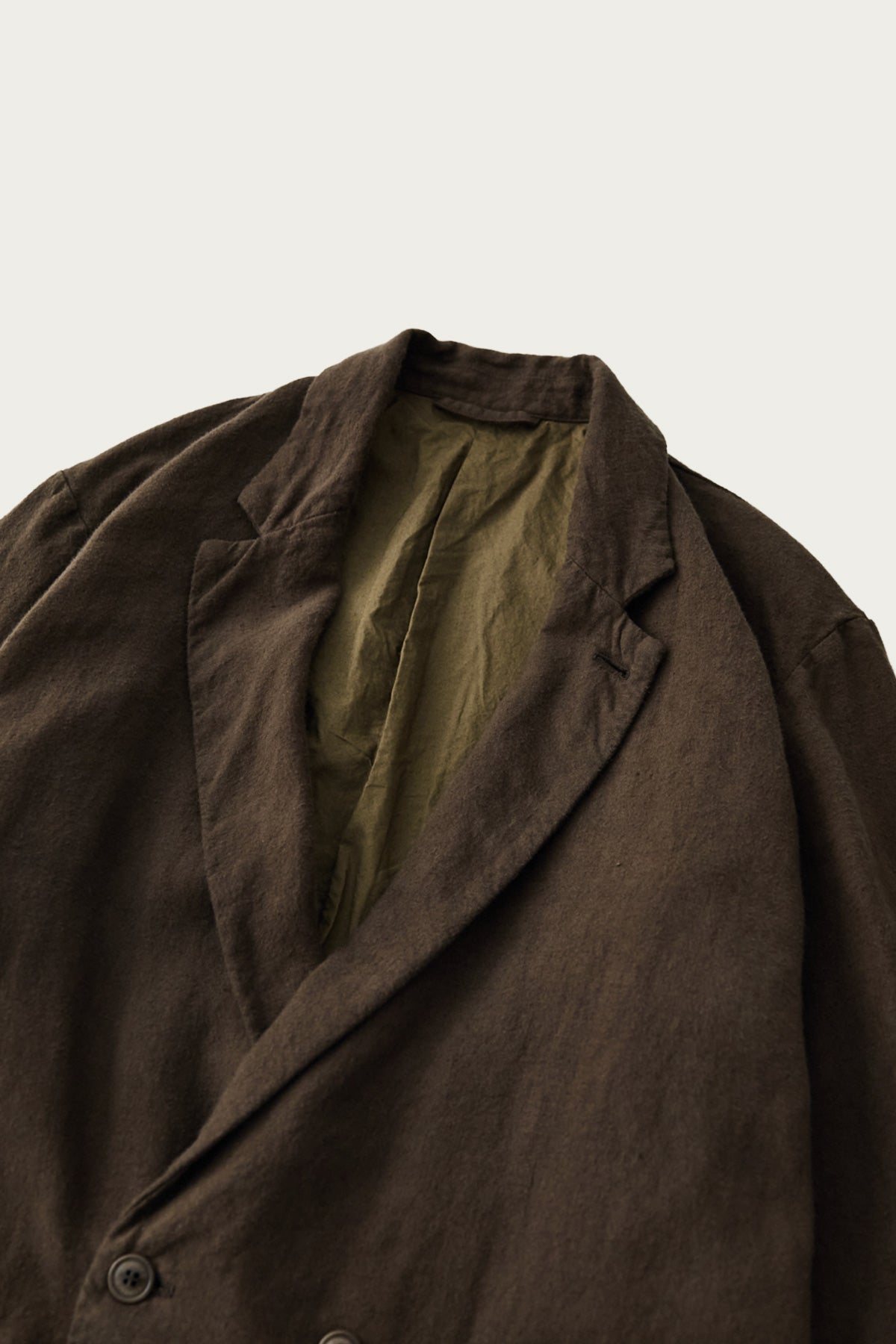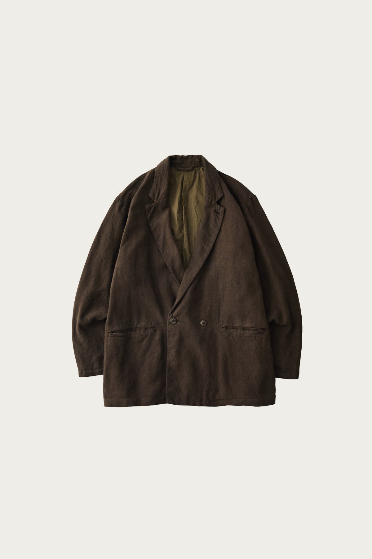 This jacket brings tailoring into a more relaxed, natural zone. Cut from a premium linen weave in a dark khaki shade, it wears softly from day one while still carrying structure. The double-breasted front gives it formality, the fabric and finish give it ease.