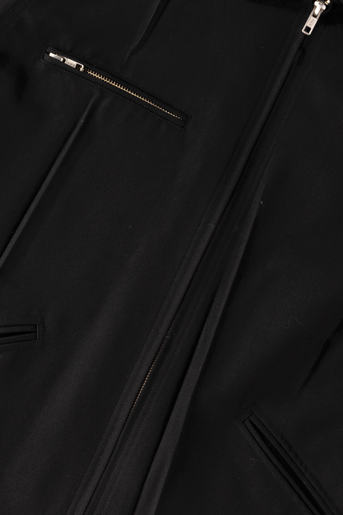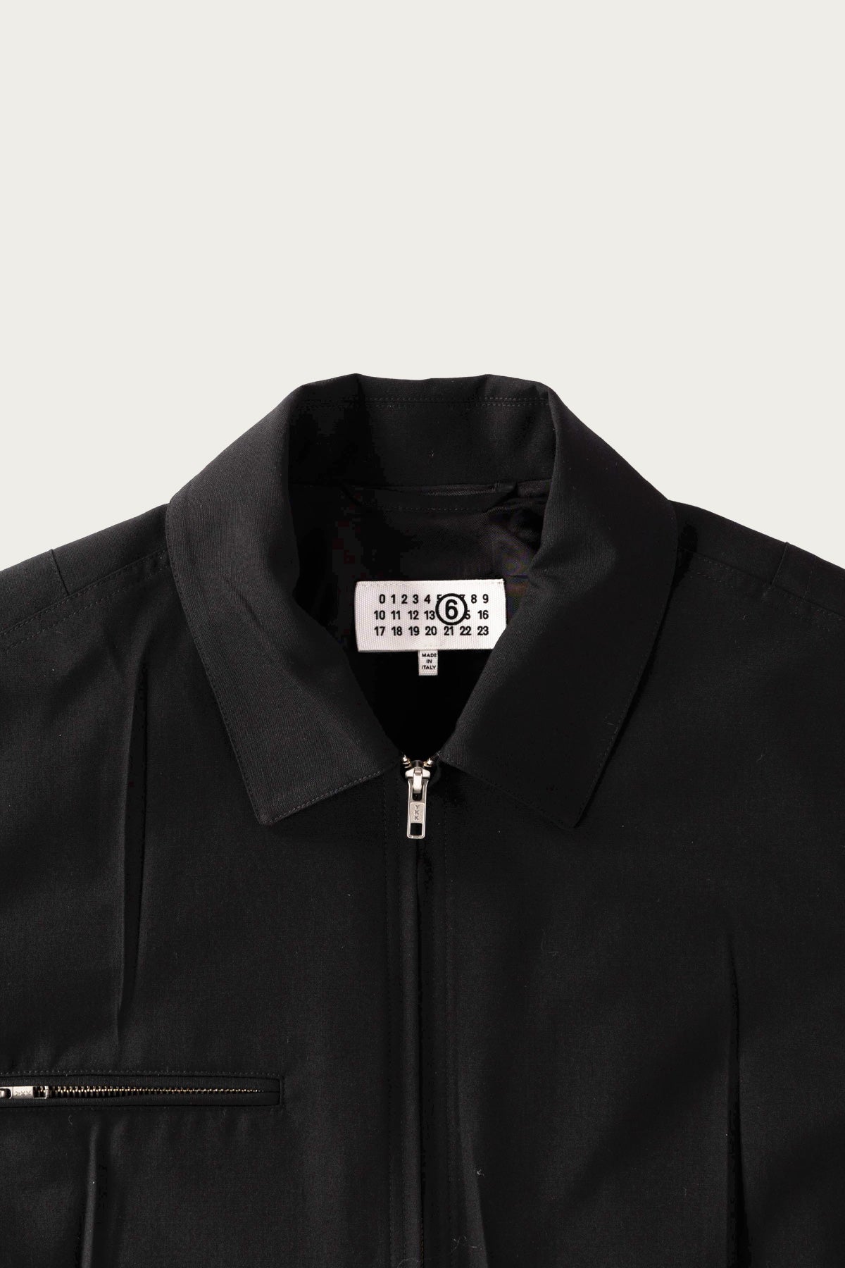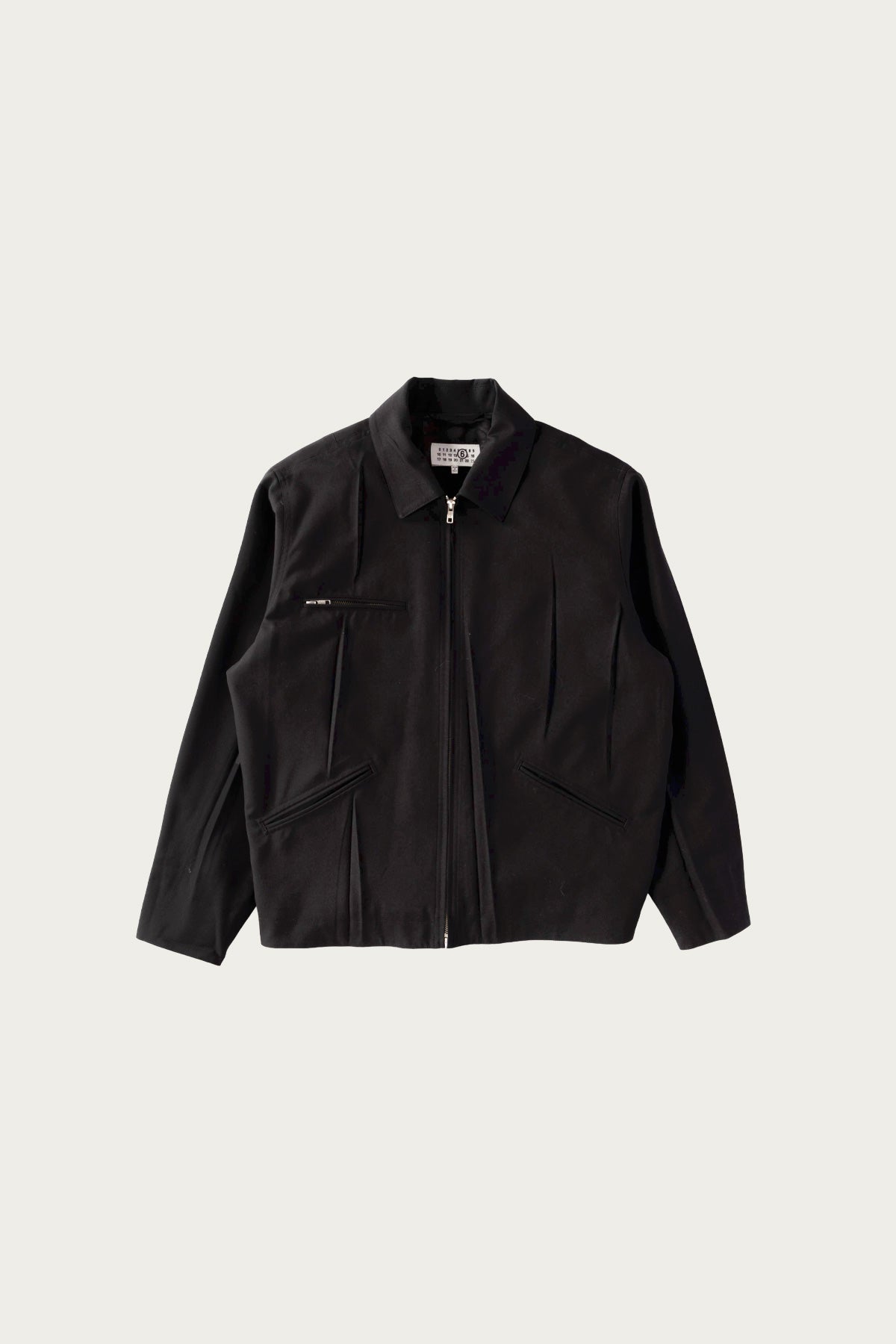 MM6 reworks a familiar zip jacket with a sculptural approach to tailoring. The clean front is interrupted by intentional darting and stitched folds that create movement and dimension across the surface. The result is a piece that feels minimal at first glance but reveals a thoughtful pattern cut and a strong sense of shape. The fabric has a smooth, structured hand that holds the silhouette without feeling rigid. A two way zipper and angled pockets round out the design with everyday function.