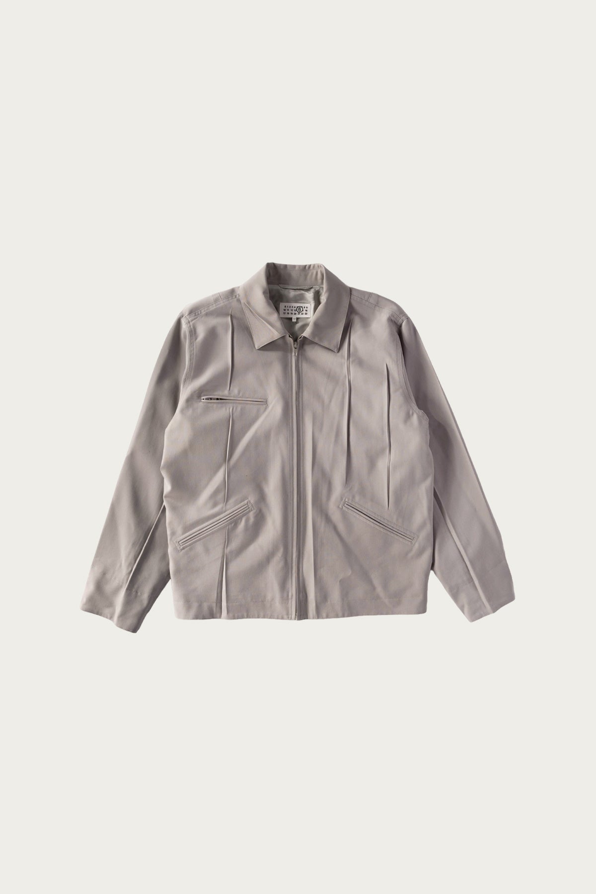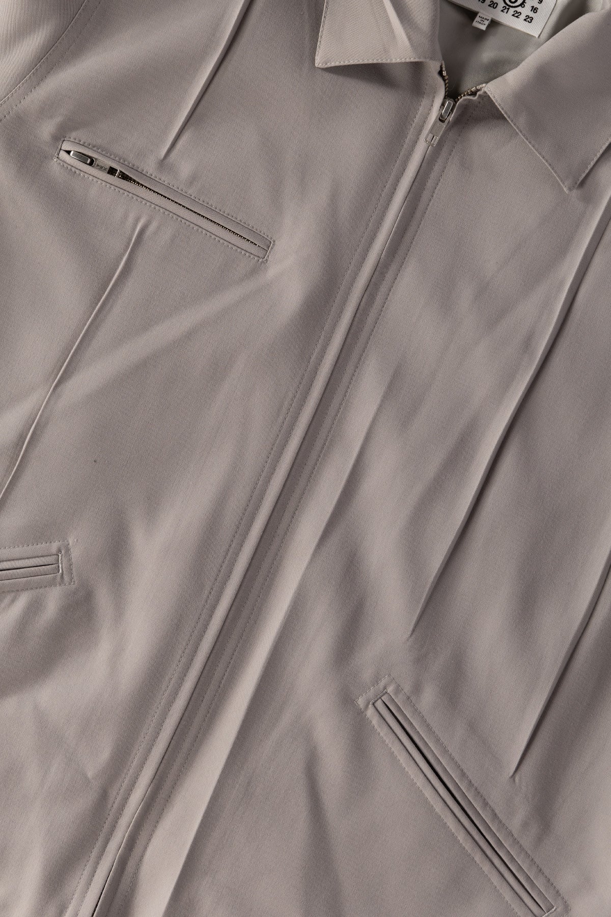 MM6 reworks a familiar zip jacket with a sculptural approach to tailoring. The clean front is interrupted by intentional darting and stitched folds that create movement and dimension across the surface. The result is a piece that feels minimal at first glance but reveals a thoughtful pattern cut and a strong sense of shape. The fabric has a smooth, structured hand that holds the silhouette without feeling rigid. A two way zipper and angled pockets round out the design with everyday function.