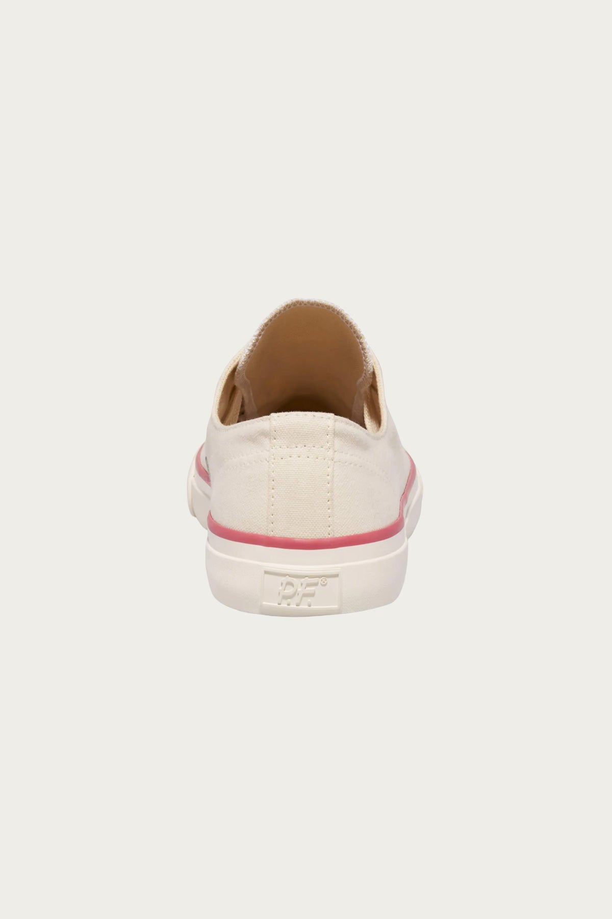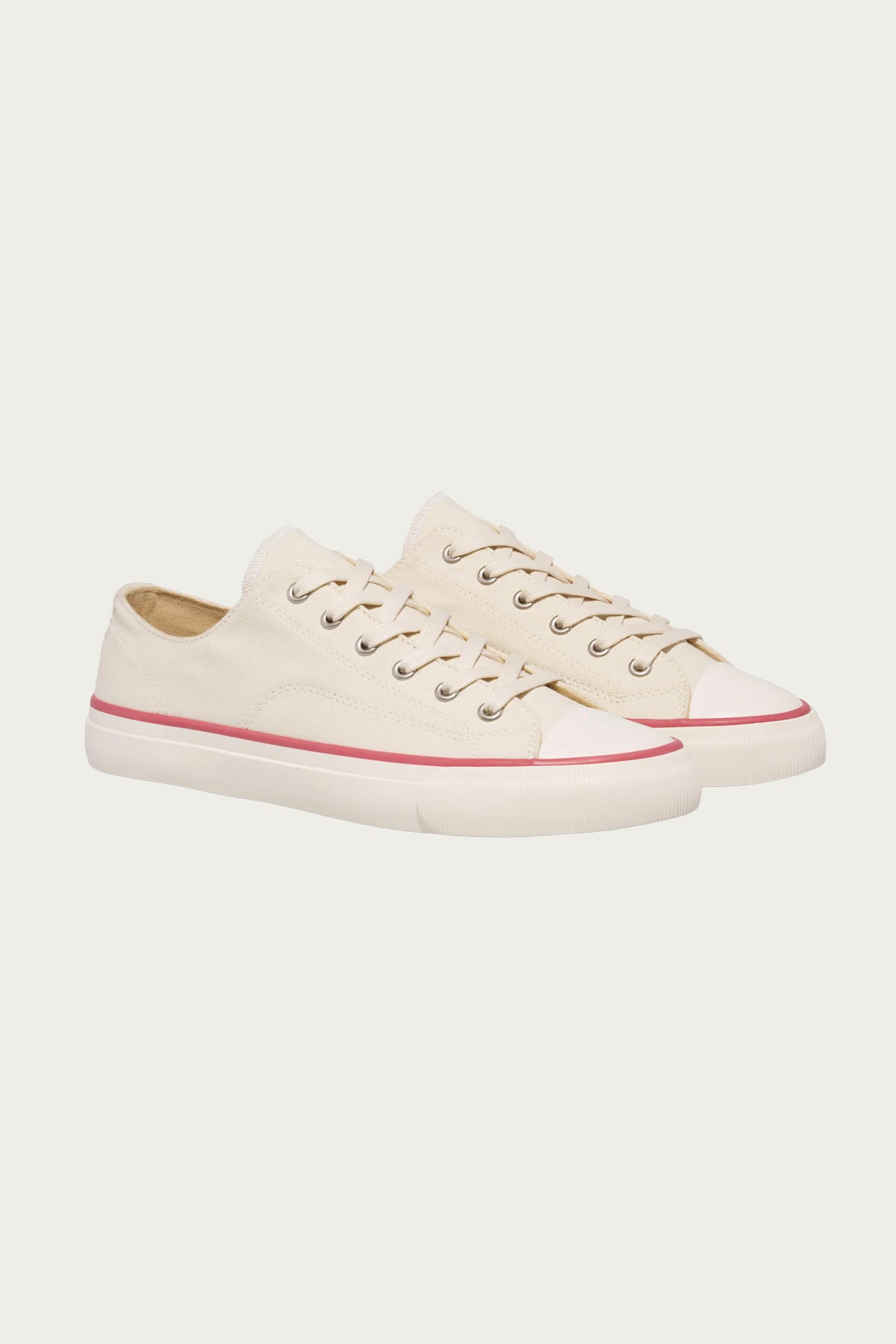 Made with a washed canvas upper in antique white and finished with sharp crimson accents, this low-top sneaker pairs vintage design with breathable canvas comfort. Its low profile and easygoing build make it a go-to canvas shoe you can wear for any occasion.