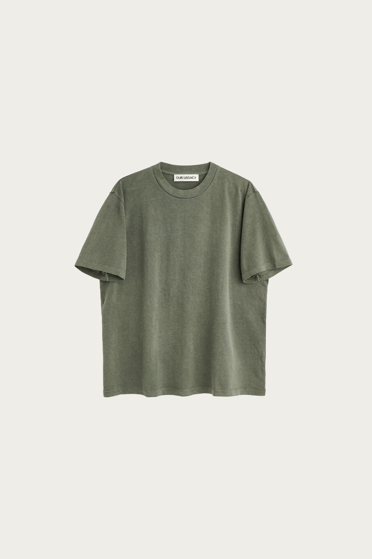 Our Box T-Shirt in Worn Olive Legacy Jersey. Produced in a Portuguese cotton jersey with a pigment-dyed, fade-out finish, the Box T-Shirt has a relaxed, boxy fit and features a ribbed collar and a straight hem, delivering a soft hand and lived-in character with subtle color variations.