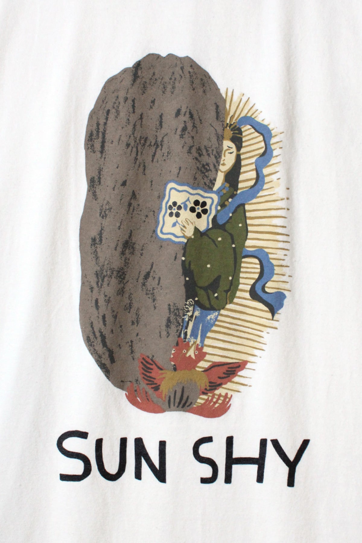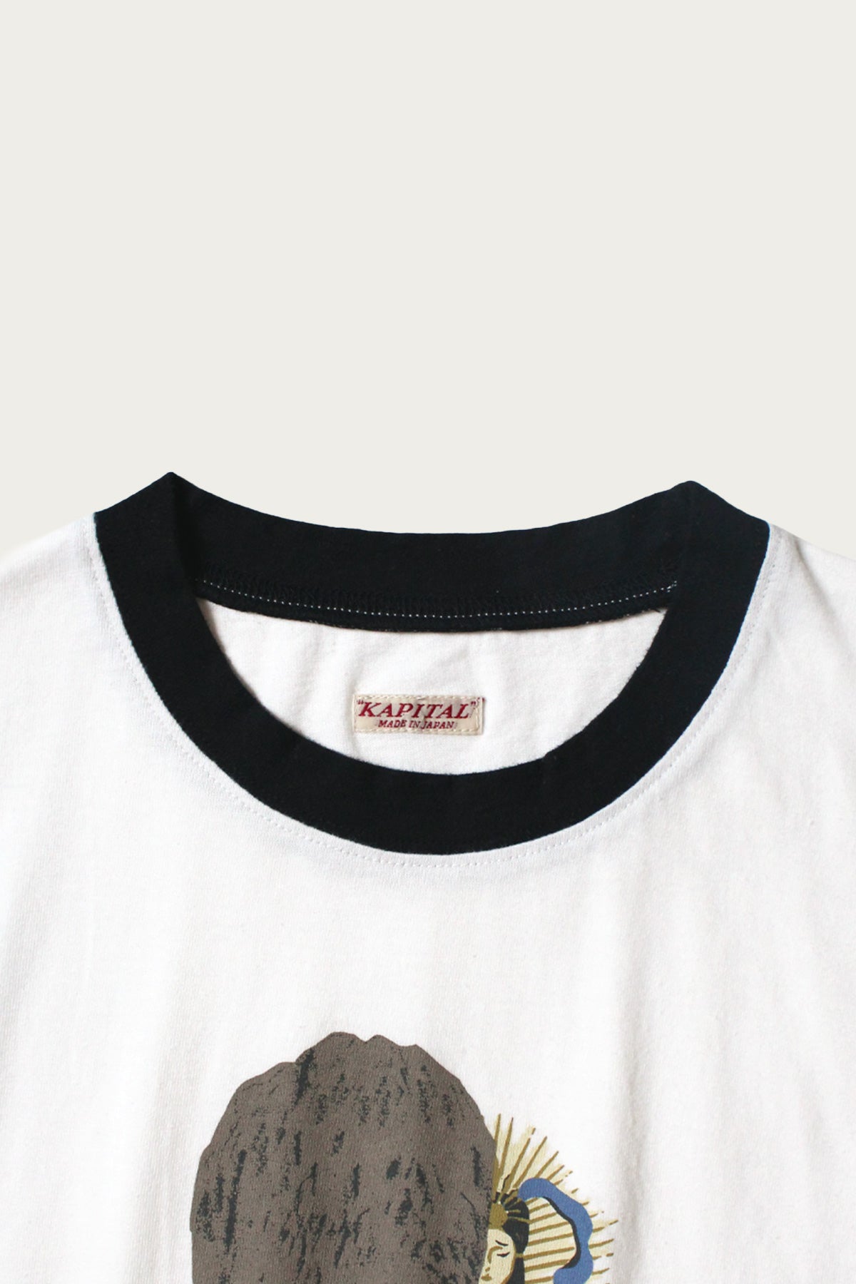 This Ringer T-shirt features a print of Amaterasu Omikami, one of the most important deities in Japanese mythology. The image depicts Amaterasu peeking out from the Ama-no-Iwato cave.