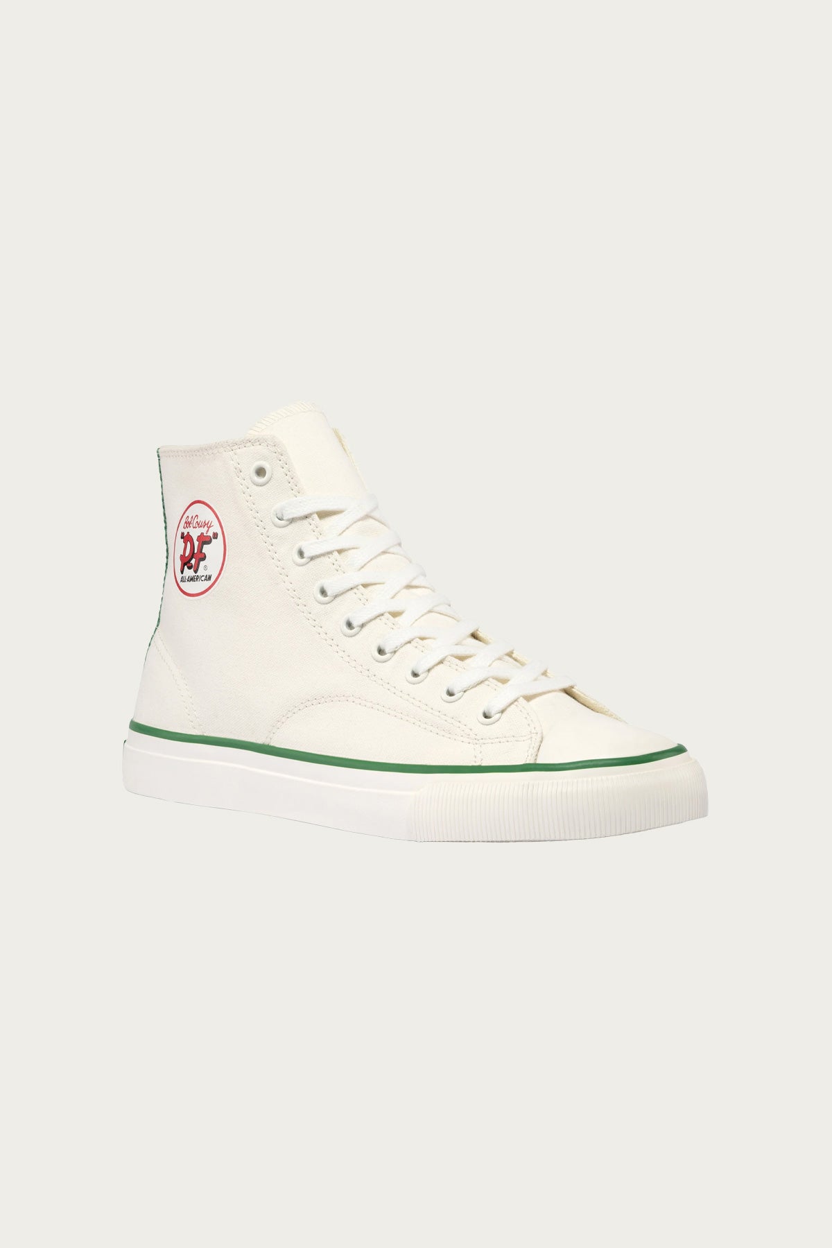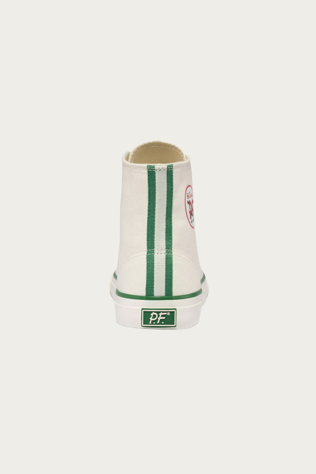 The off-white canvas upper brings subtle texture and a classic, worn-in finish. A combination P.F. Flyers / Bob Cousy ankle patch adds subtle throwback energy, while a gum rubber outsole and ribbed toe bumper provide structure and traction. It’s a minimal look with a maximum history, built to move and built to last.