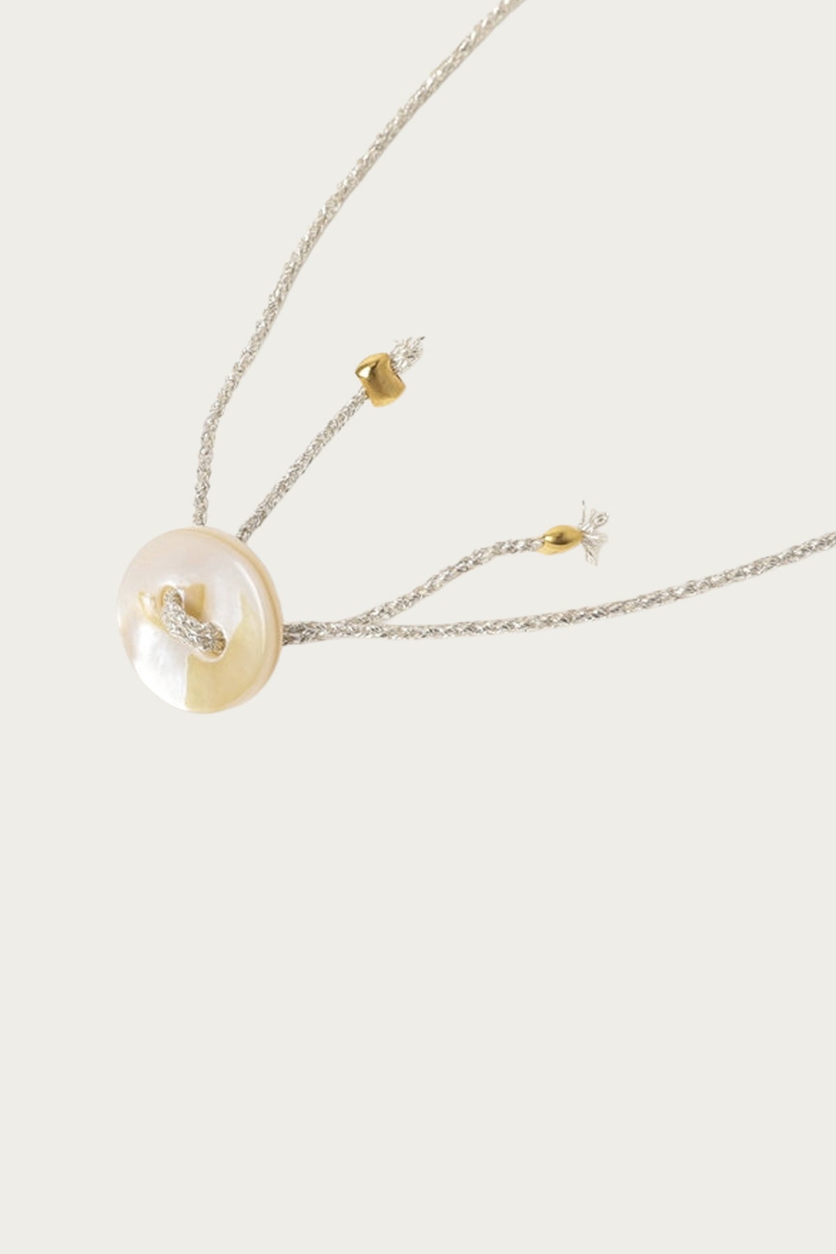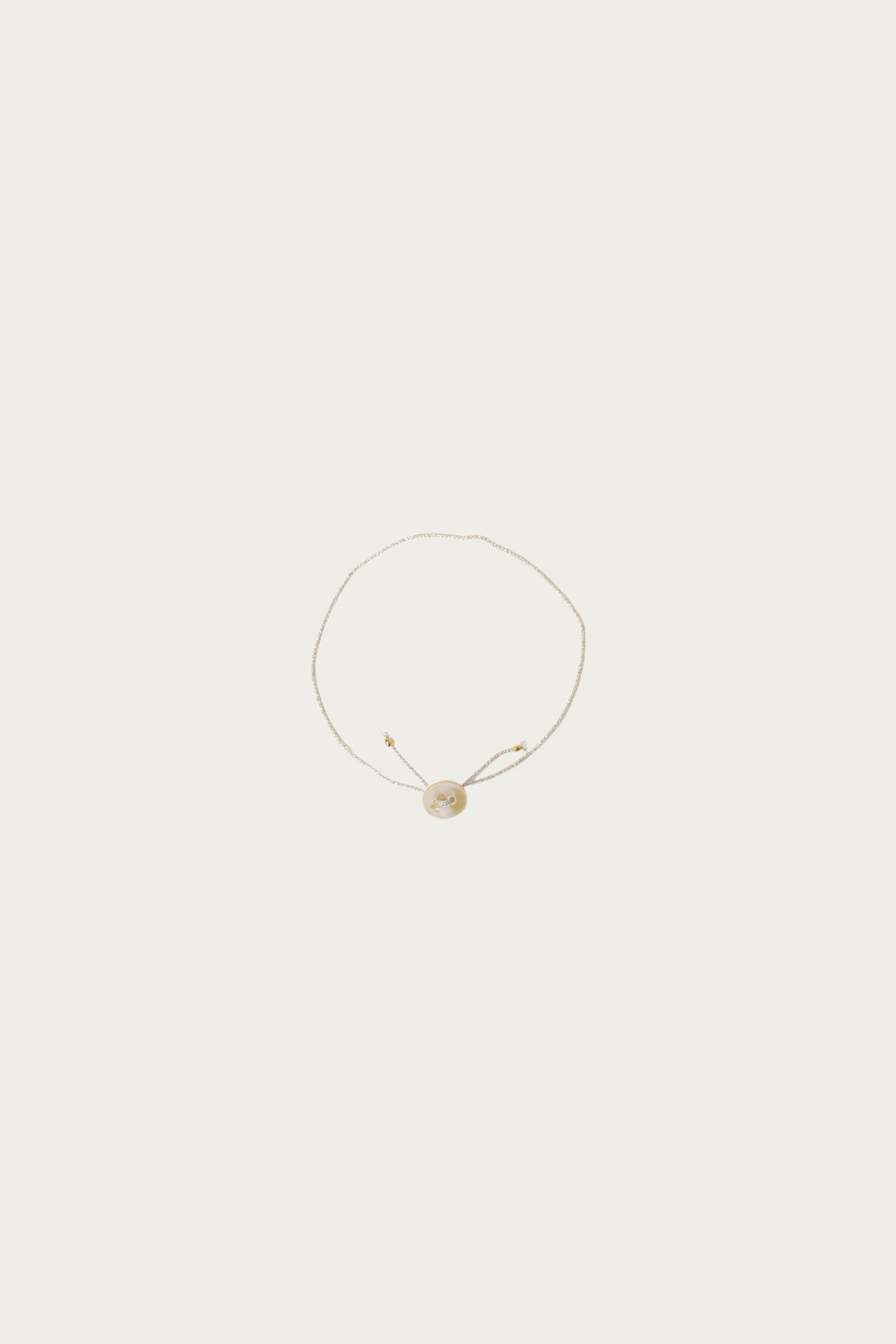 Jinbo Pearl brings its refined shell craftsmanship to a simple and thoughtful bracelet made for Beams Japan. This version features a mother of pearl button with a cool silver tone cord that highlights the natural shine of the shell. The adjustable design keeps the fit easy and relaxed, and the overall look stays subtle while still feeling meaningful. A quiet piece that speaks through craft rather than flash.