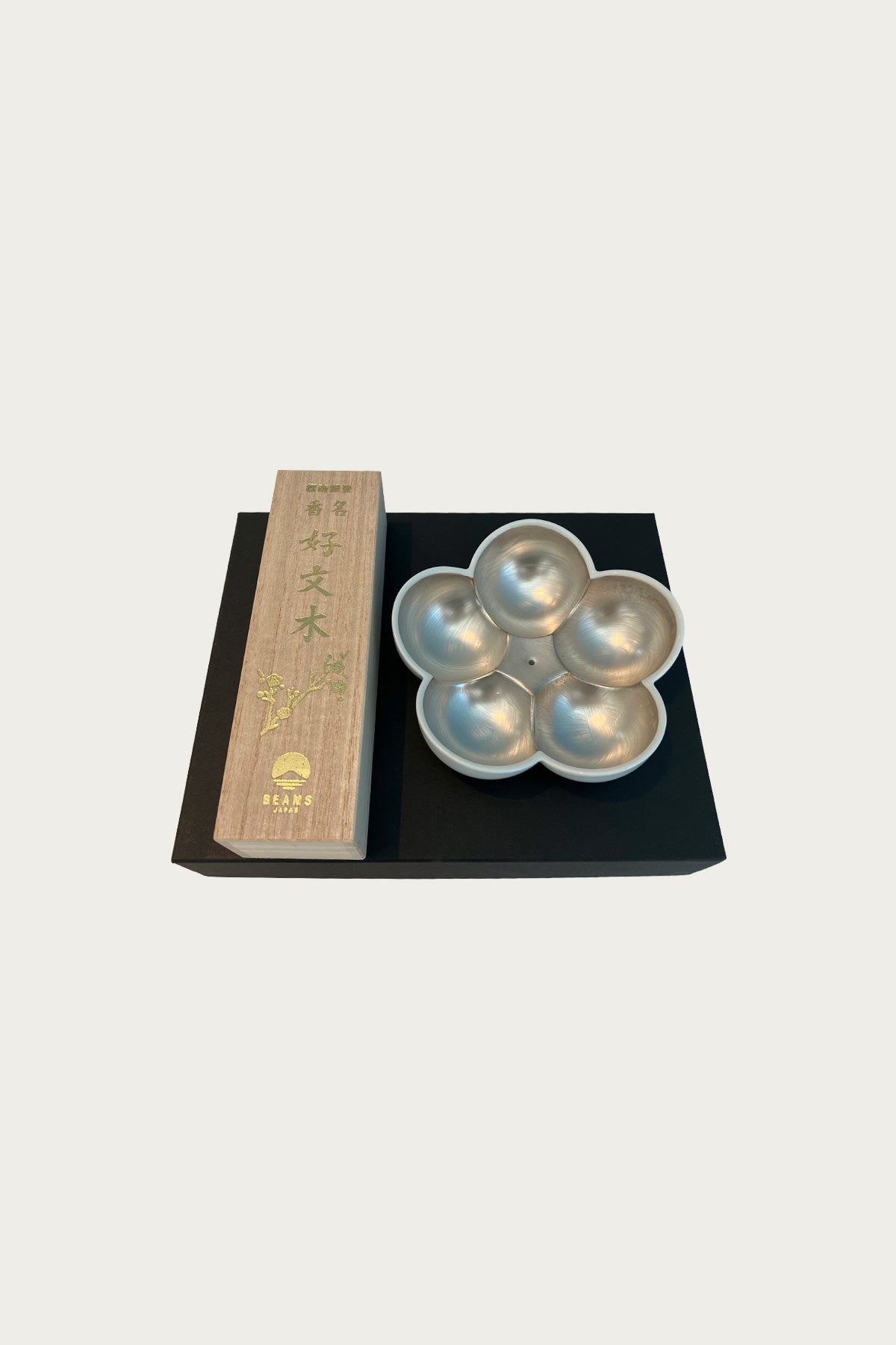A beautiful incense set crafted in collaboration with Baieido, one of Japan’s oldest incense makers. The wooden case opens to reveal a cast-metal stand shaped like a plum blossom, with five petals forming shallow bowls that catch the ash. Clean, calming, and made with a deep respect for traditional fragrance craft.