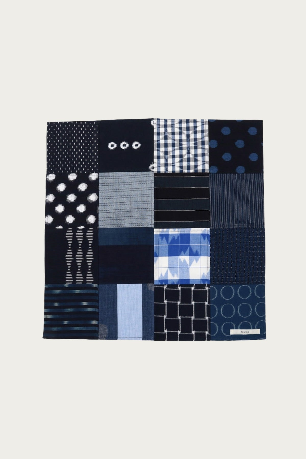 A beautiful mix of traditional Japanese textiles, this patchwork cloth brings together indigo-dyed patterns, sashiko-inspired stitching, ikat, stripes, checks, and dots in one thoughtfully balanced square. Each panel highlights a different technique, giving the piece a rich texture and a quietly collected feel. Lightweight, soft, and endlessly useful, it works as a table accent, bandana, wall hanging, or wrap.