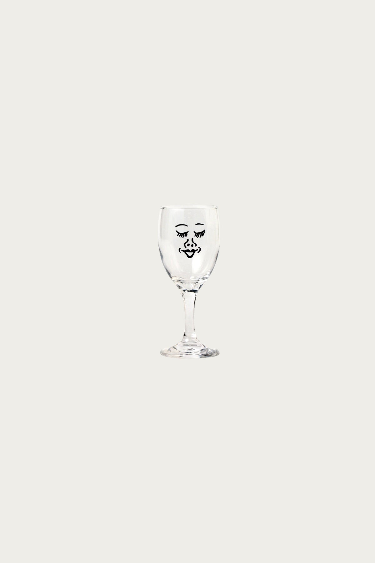 - Clear wine glass with printed “Lady” face graphic