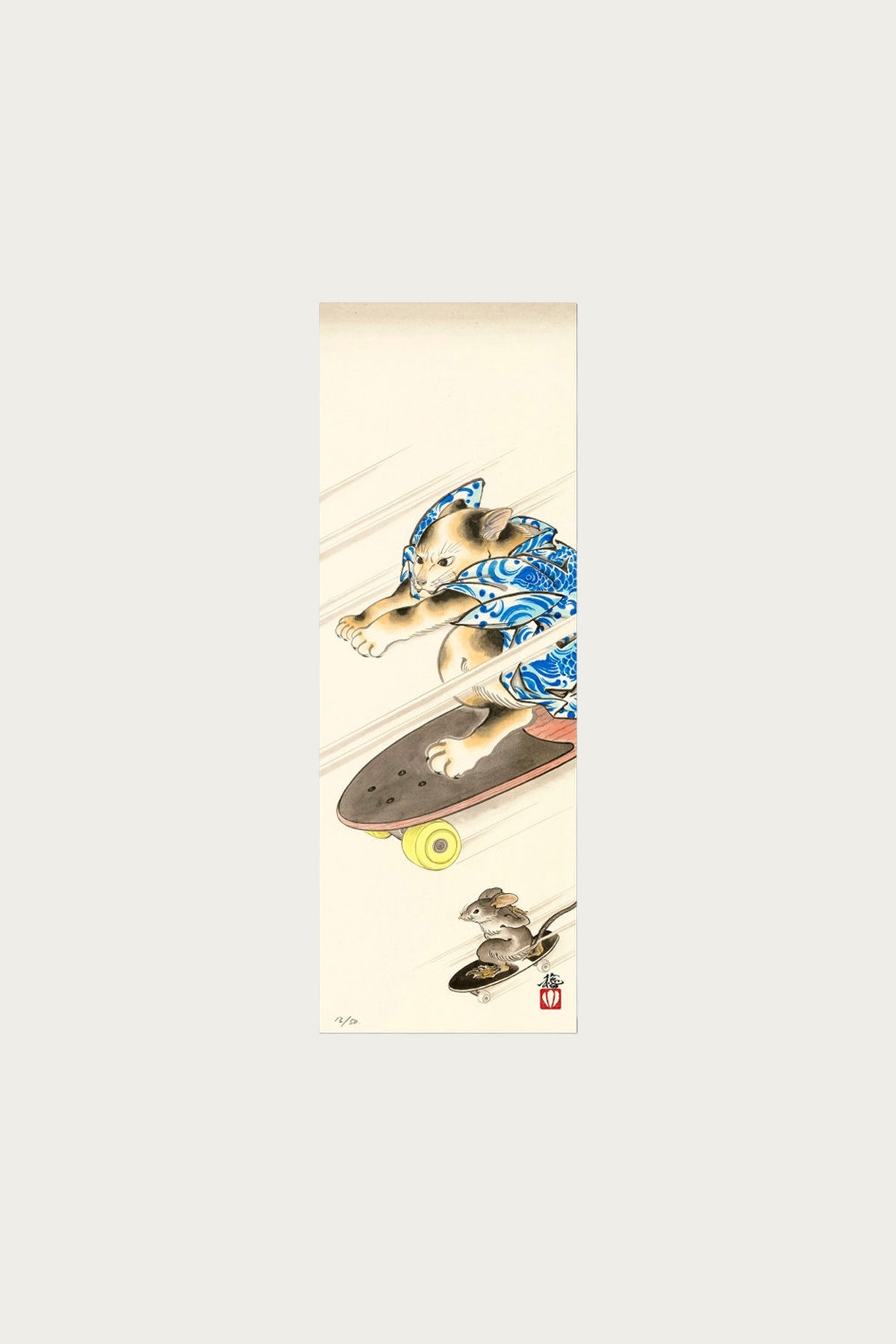 A dynamic giclée print from artist Toshikazu Nozaka featuring a kimono-clad cat carving through the scene on a skateboard, with a mouse chasing below. The artwork blends ukiyo-e inspiration with playful modern humor, printed with crisp detail in a large A2 format.