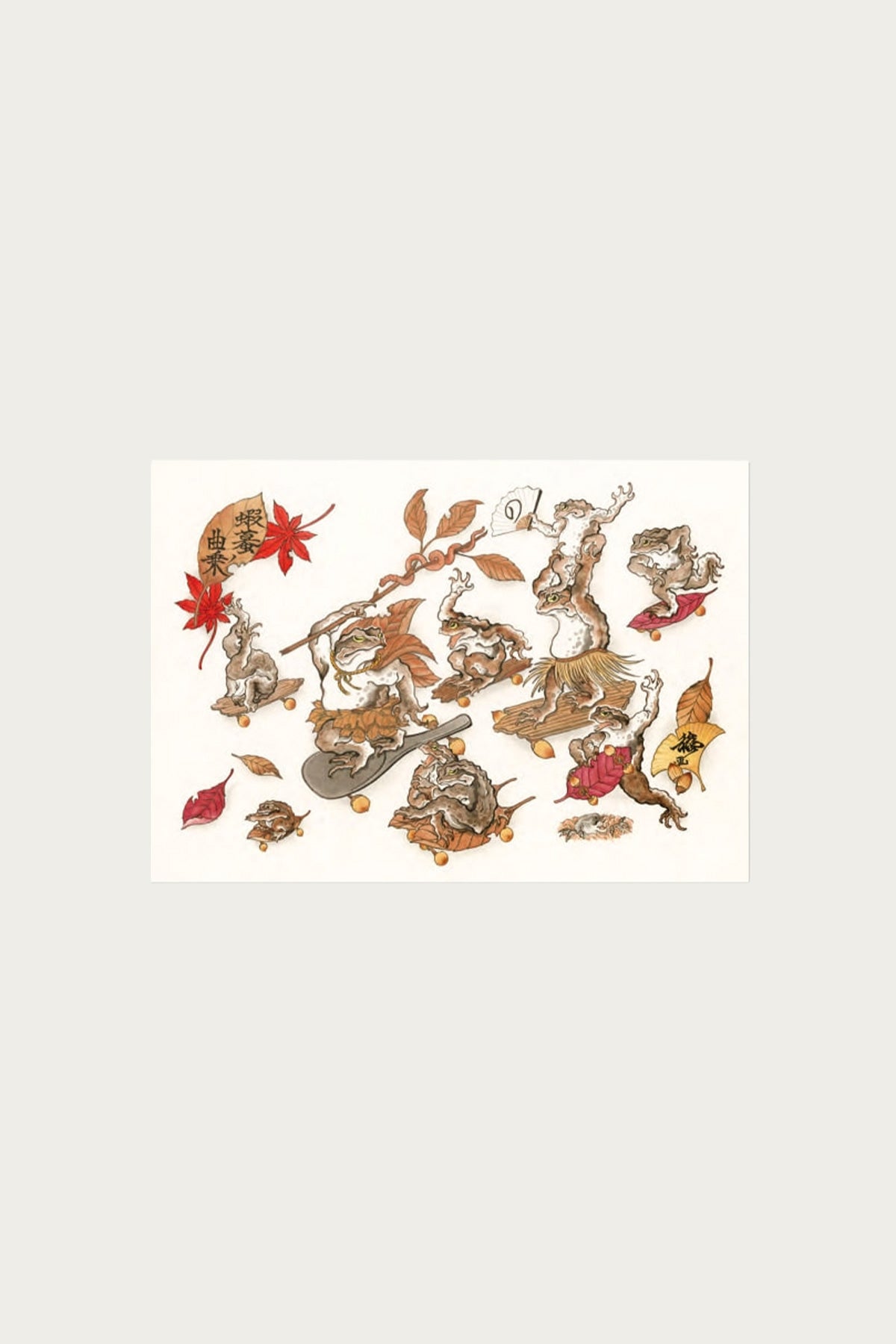 A lively gathering of frog characters illustrated by Nozaka Toshikazu, each captured in motion with swirling leaves and small props that hint at a larger story. The muted browns and reds create a warm seasonal palette, while the expressive poses give the artwork a rhythmic and almost musical feeling. Every figure has its own personality, and the clustered composition invites slow viewing and appreciation of the fine brushwork.