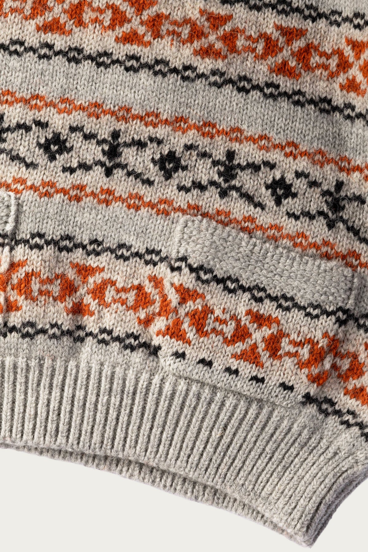 Kapital leans into cold-weather nostalgia with their Yellowknife Fair Isle Crew, knit in a plush three-gauge wool that feels warm, weighty, and ready for the season. The patterning is a playful mix of traditional motifs and Kapital’s signature offbeat charm, done here in soft greys with warm orange accents that brighten the whole piece. The fit is relaxed with a comfortable drape, finished with ribbing at the collar, cuffs, and hem, plus a handy front pouch that adds to the lived-in feel.