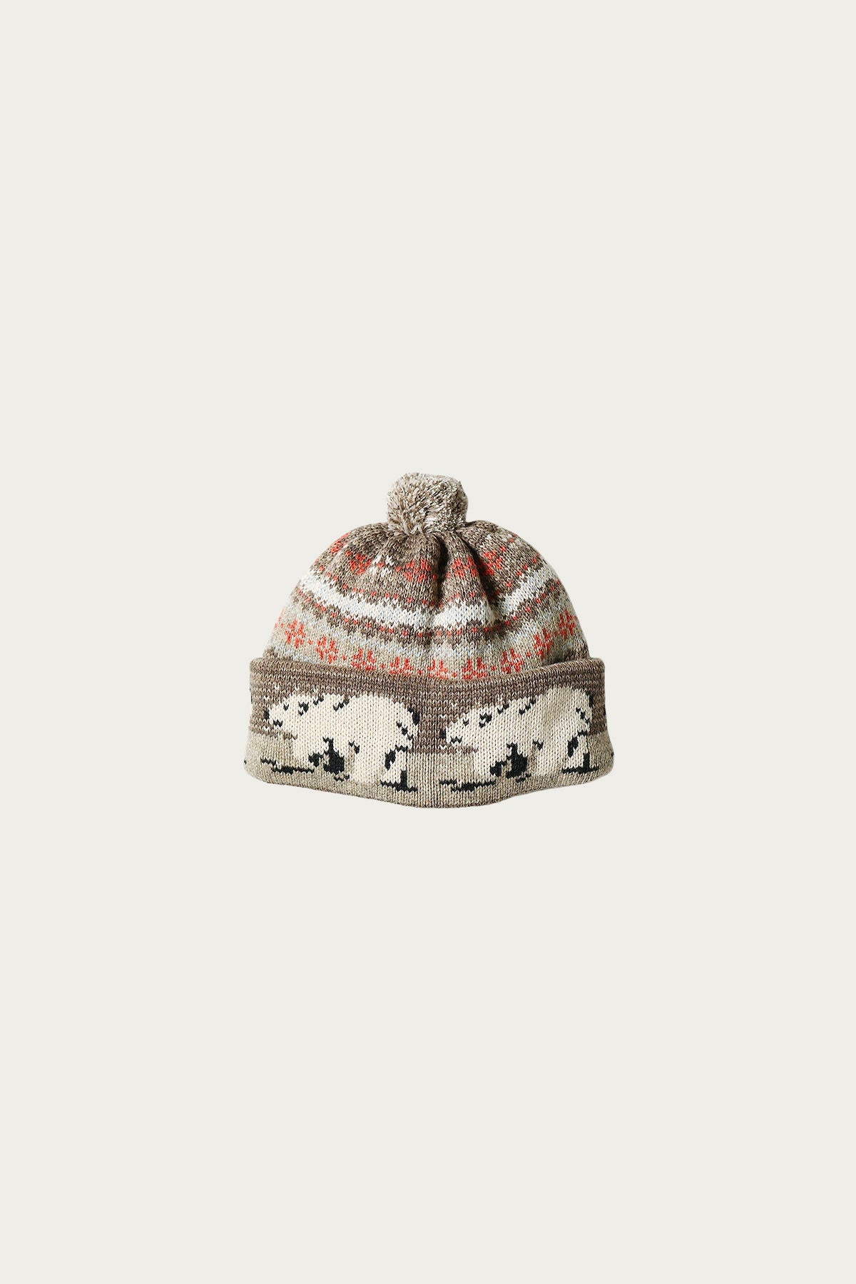 Kapital leans into their playful knit language with a cold-weather cap that feels equal parts nostalgic and adventurous. Knit in a cozy mid-gauge wool, the hat features a full band of wandering polar bears and a colorful Fair Isle crown topped with a soft pom. It is warm, lightweight, and full of the character that makes Kapital knits so fun to wear.