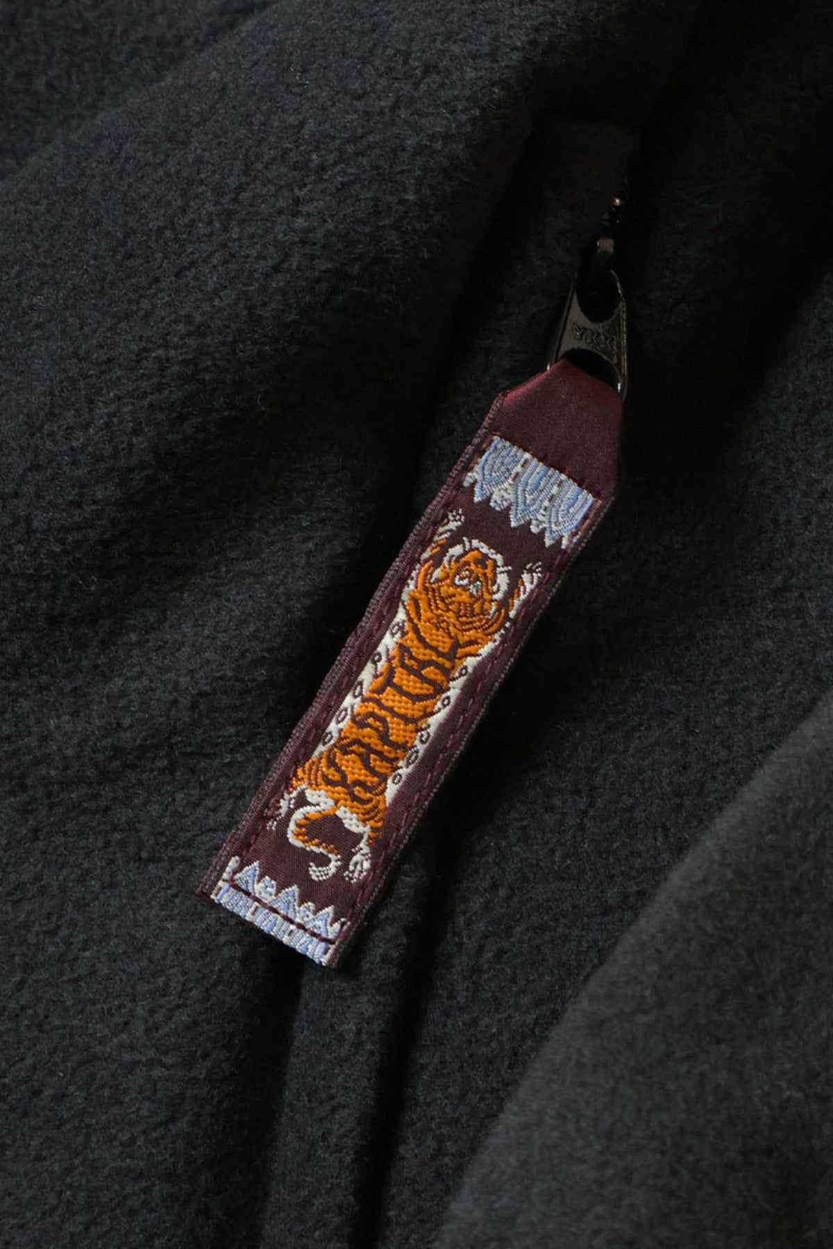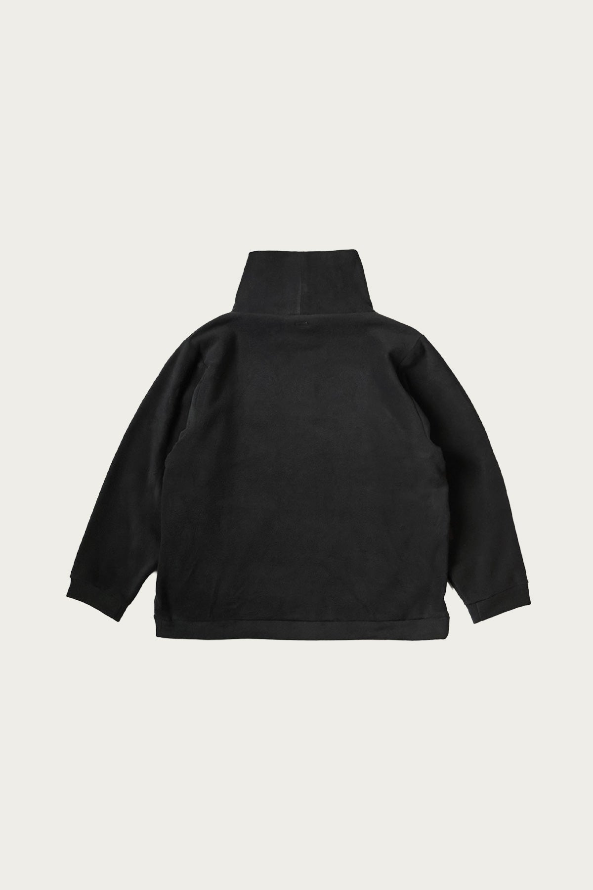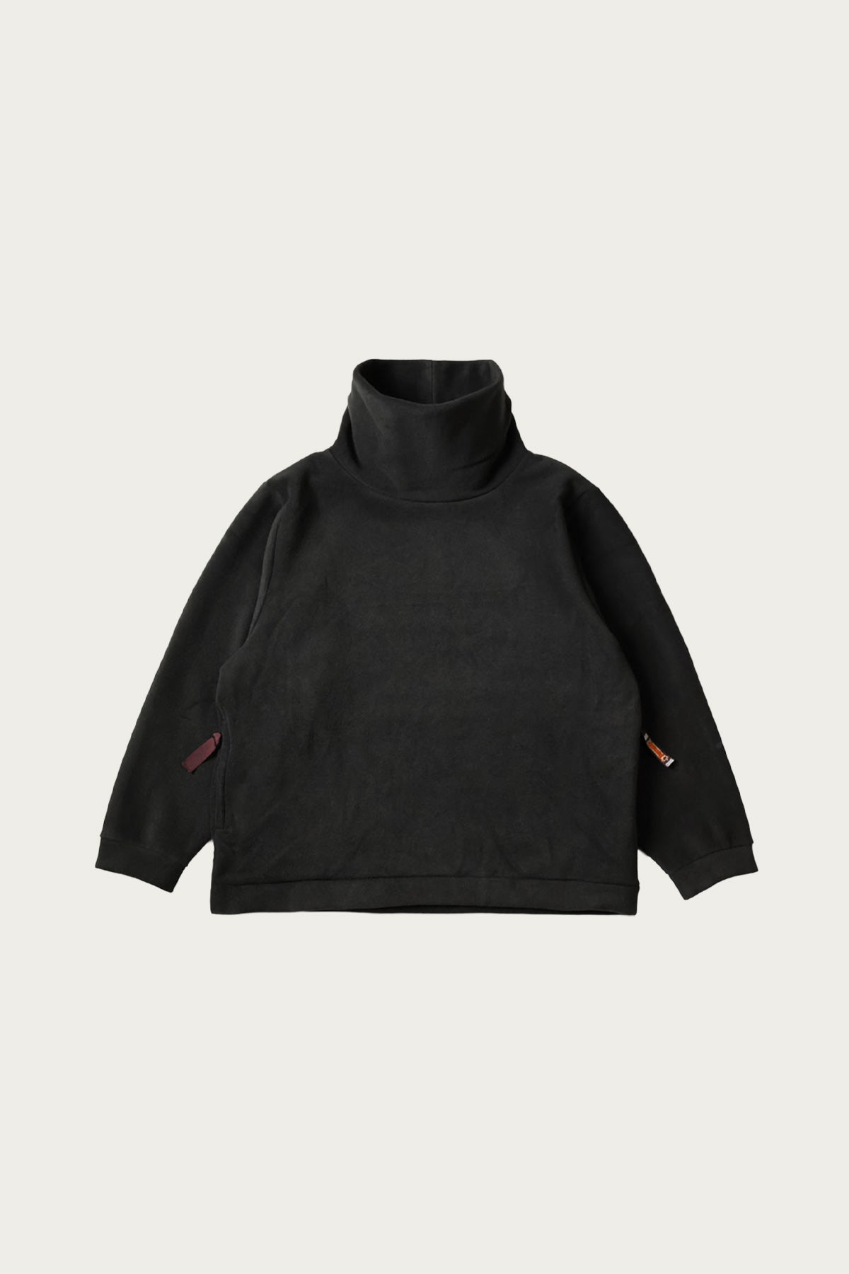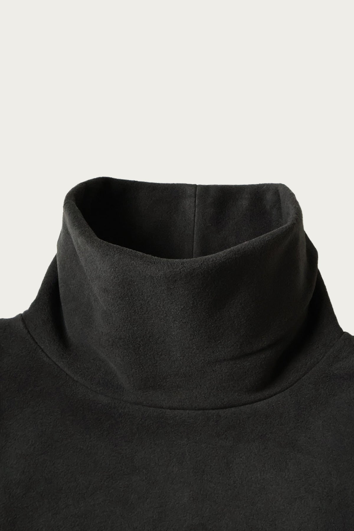A quietly distinctive sweatshirt that leans into shape, weight, and texture rather than graphics. Cut with a wide, relaxed body and finished with a sculptural high neck, this piece feels protective and intentional without trying too hard. The reverse fleece construction gives it a dense, almost felted hand that wears beautifully over time, while the earthy brown tone keeps it grounded and versatile. Easy to style with loose denim, fatigues, or wool trousers when you want something comfortable that still feels considered. Black colorway.