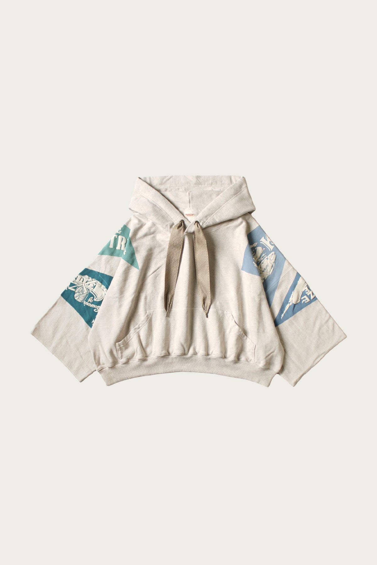 This cropped fleece hoodie leans hard into Kapital’s graphic storytelling, pulling vintage pennant motifs and outdoor folklore into something that feels playful but intentional. The soft fleece body is balanced by a wide, boxy silhouette that sits just right at the waist, with bold printed panels running across the sleeves for contrast and character. It has that worn-in feel straight off the rack, like something you’ve had forever but somehow just found again.