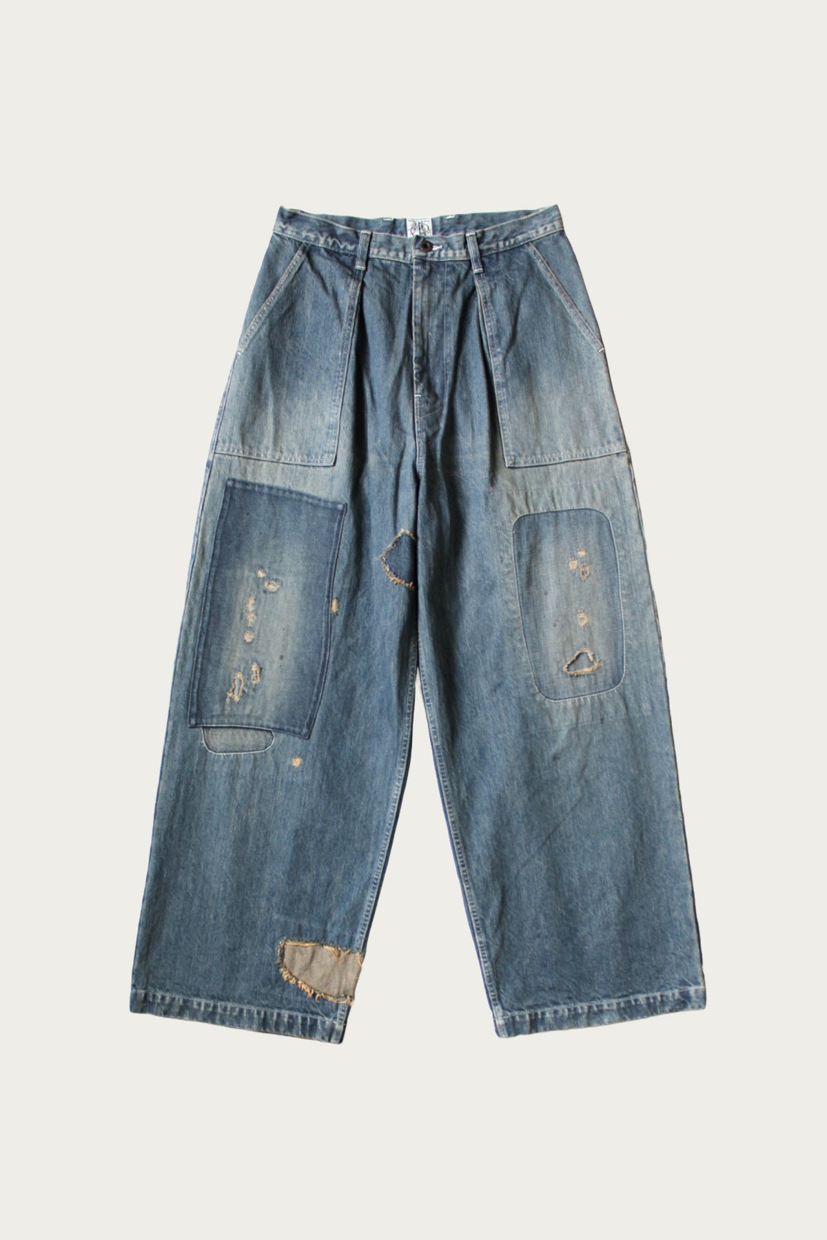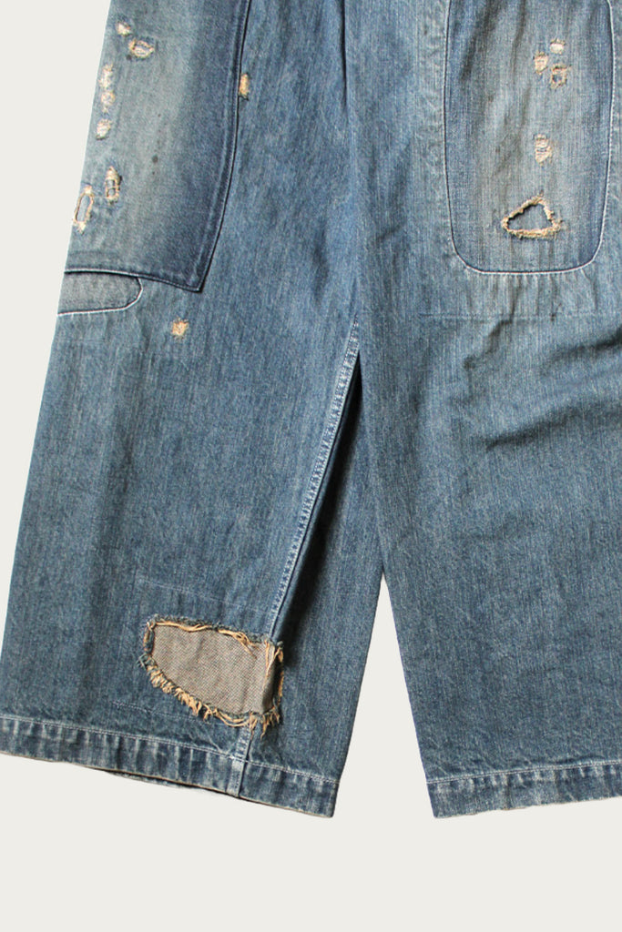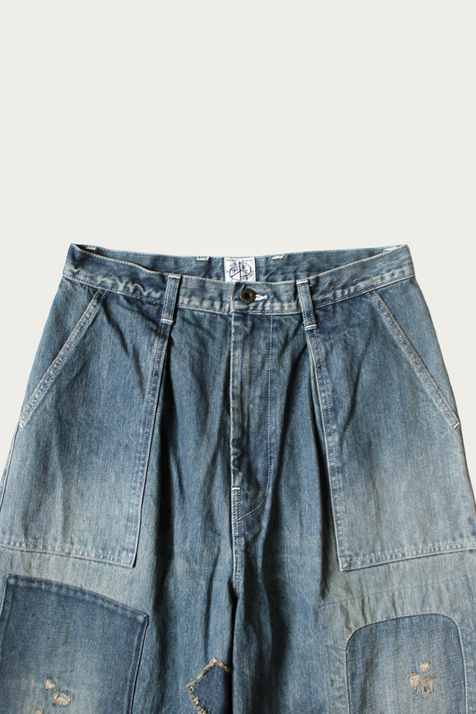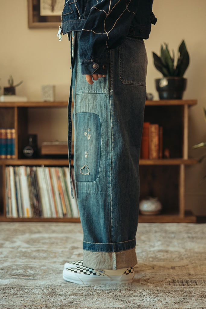 Kapital reimagines classic military wear through a distinctly DIY lens with the RUSHFIELD Remake Fatigue Baggy Pants. Built from sturdy 14oz denim, this pair takes the shape and utility of traditional fatigue trousers and infuses them with raw, lived-in energy. Hand-finished distressing, patchwork, and reinforced paneling transform each pair into a one-of-a-kind artifact—part vintage, part experimental, all Kapital.