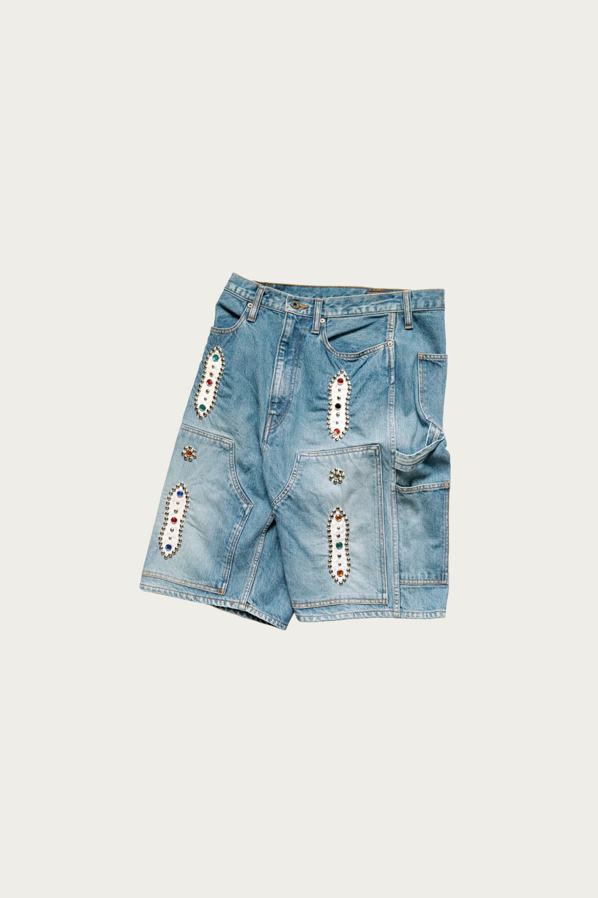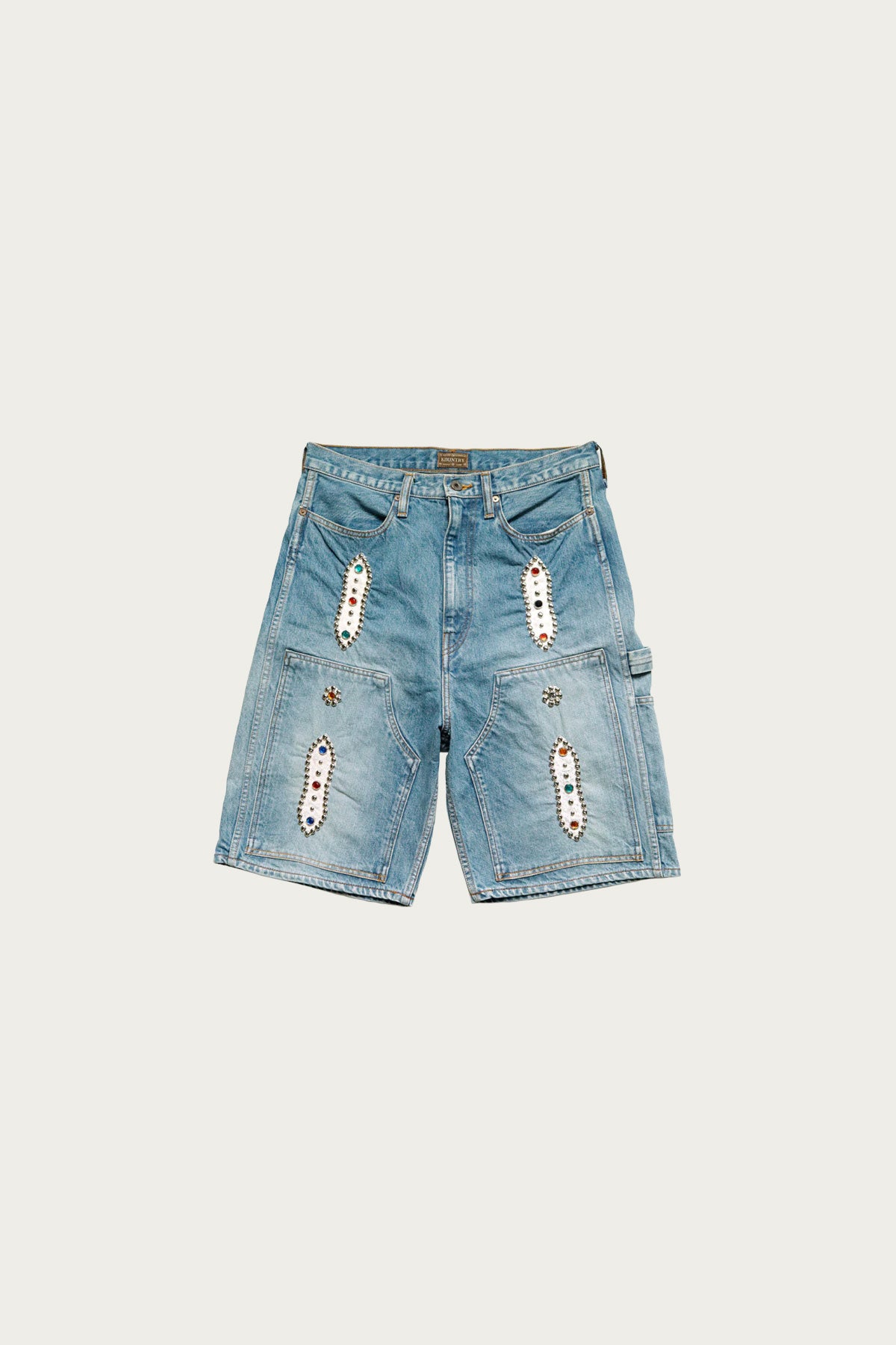 The 14 oz Denim Short Pants feel like denim workwear pulled into the present day with KAPITAL’s maker energy. Built in Japan from heavy 14 oz cotton denim, they’re given a second-hand style wash and finished with metal studs embedded across the front. Each pair carries its own variation in finish and hardware. The indigo processing gives deep tone, texture, and character from day one. With a relaxed short length, side and back pockets, and utilitarian detail, they’re shorts made to age, layer, and wear with purpose.