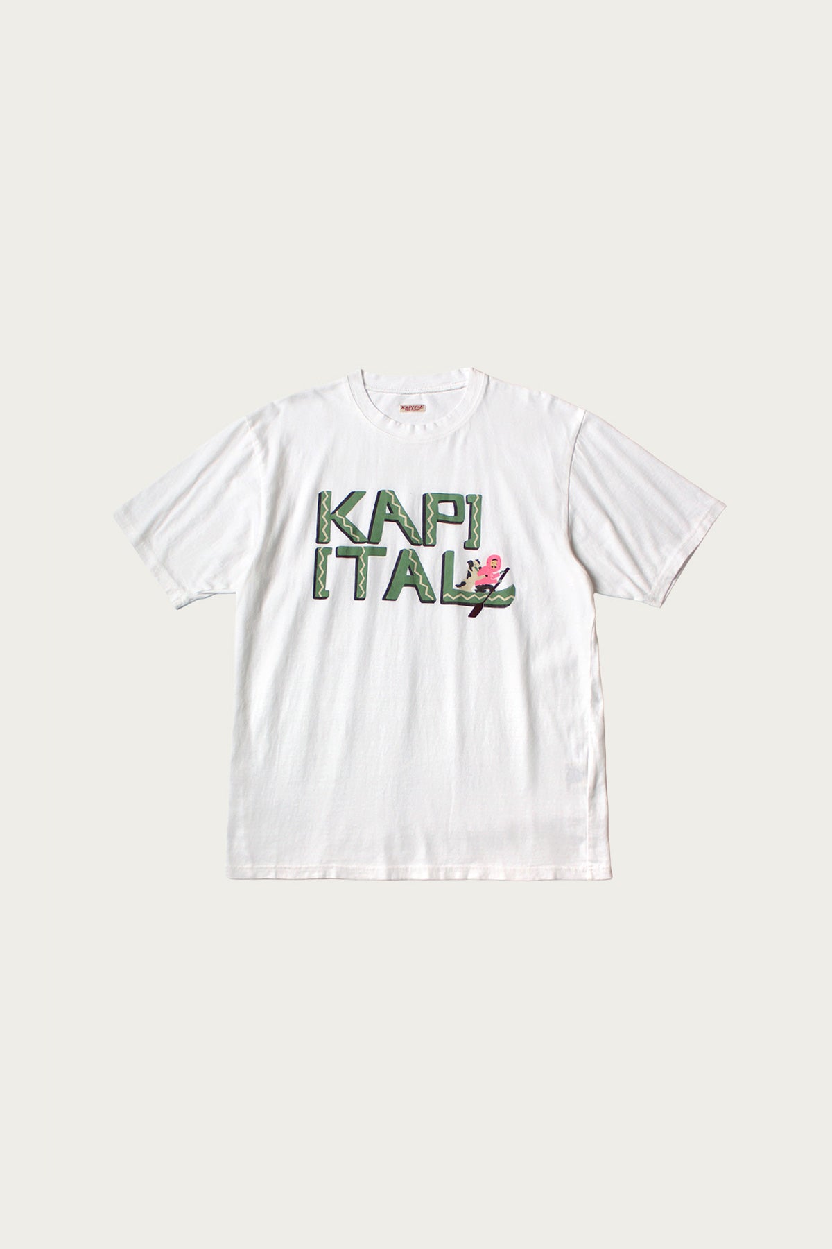 A timeless white tee elevated with Kapital’s hand-drawn graphic style. The green lettering brings a natural vibe that works year round and the soft jersey feels broken in from day one.
