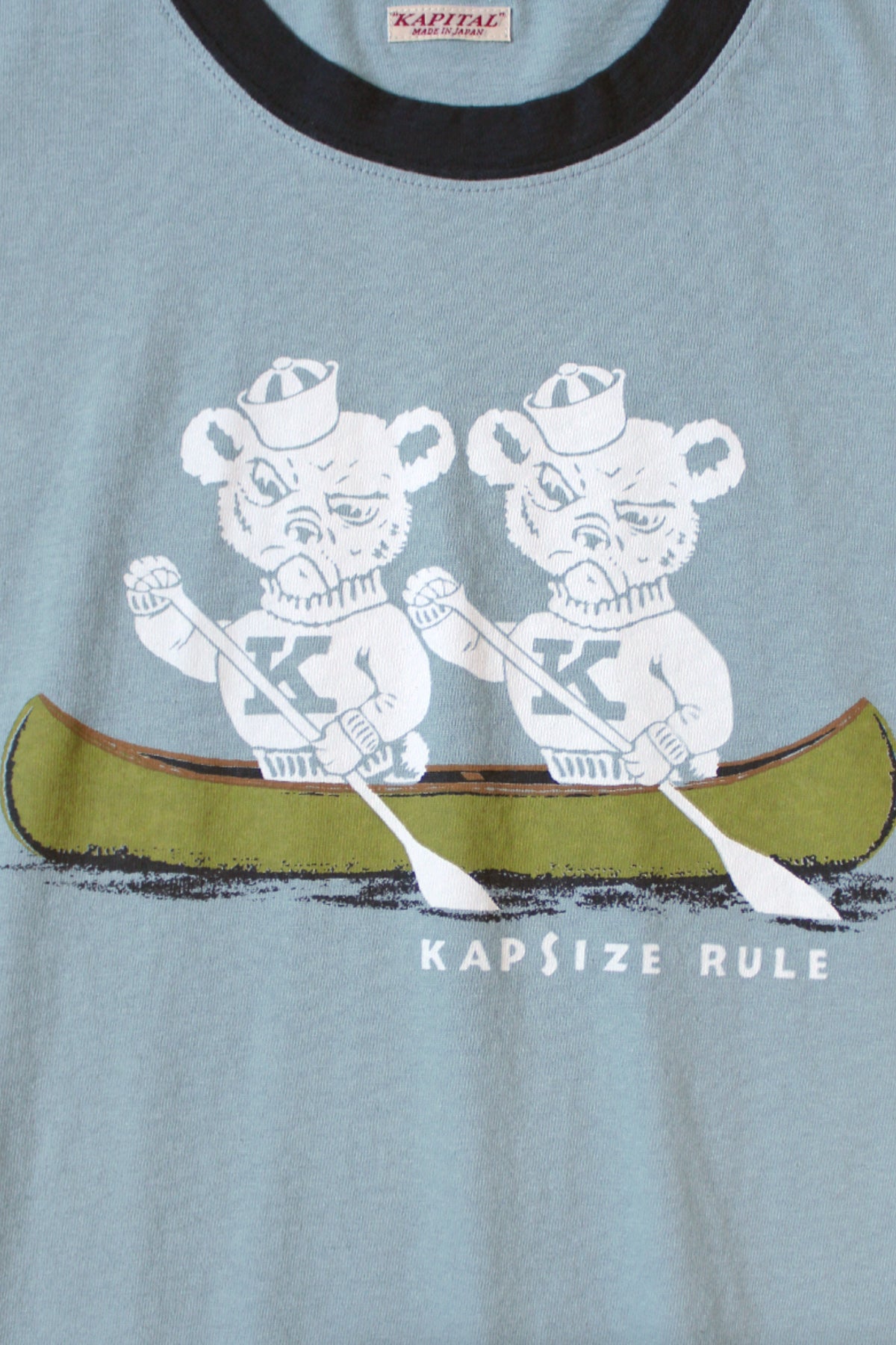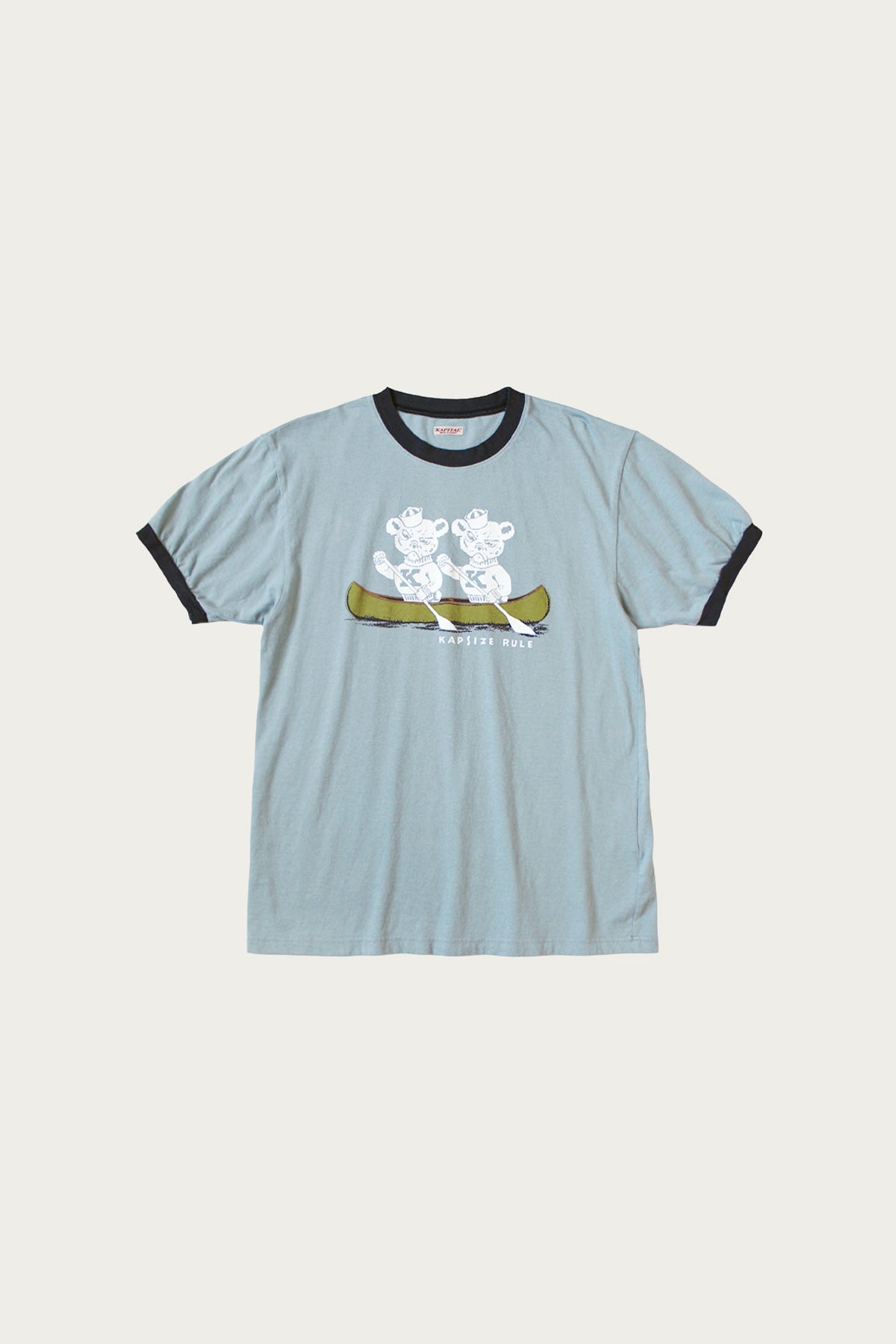 Vintage gym style ringer tee with the double paddle K Bear print. Soft washed jersey with contrast ribbing. Looks great with denim, fatigues, or under a cardigan.
