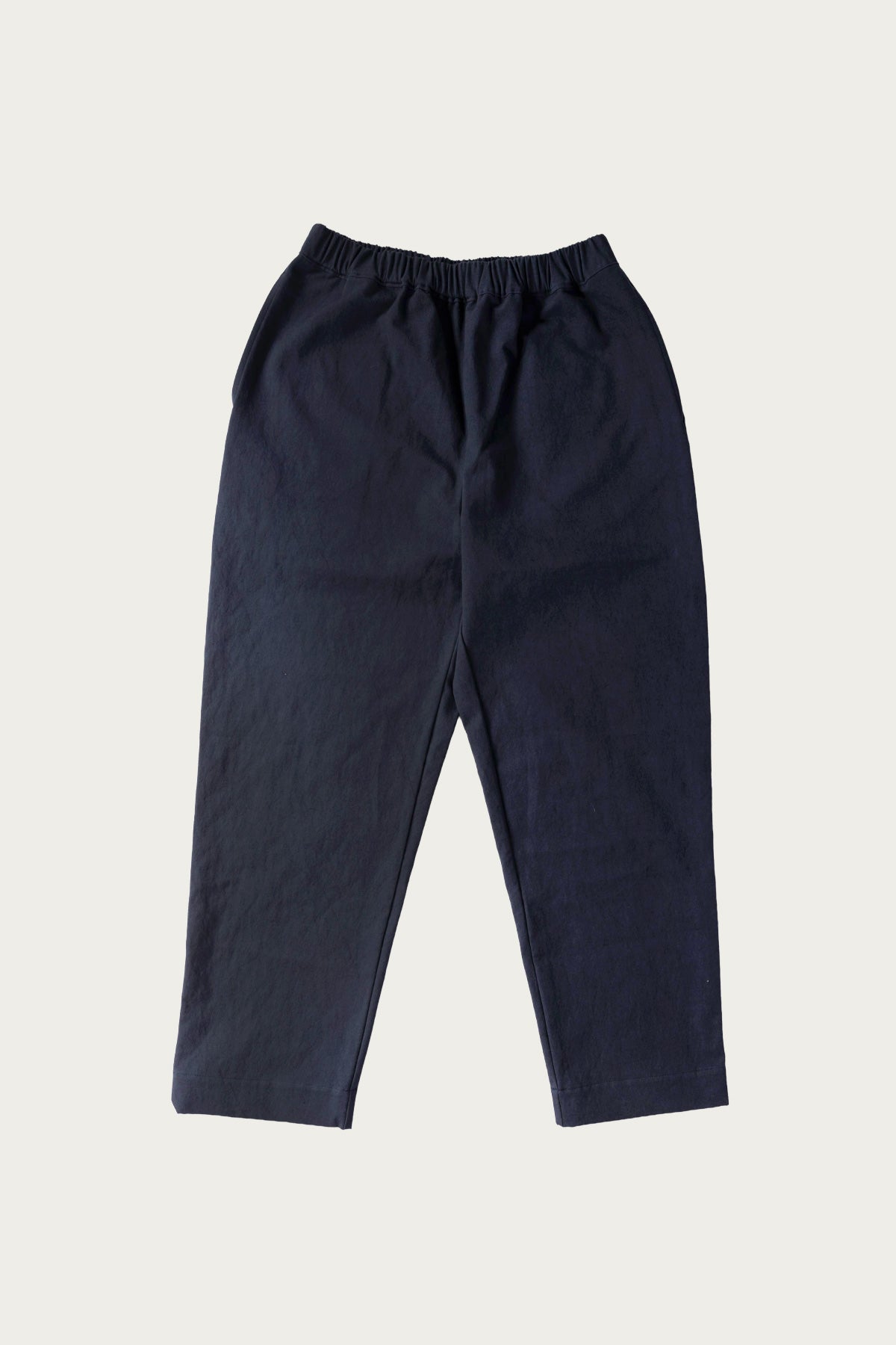 The Café Pant from William Frederick is built for easy wear with thoughtful texture and shape. Cut from a vintage-washed cotton-linen canvas in a rich navy blue, the fabric feels soft but structured, with the kind of hand you only get from natural fibers. The elastic waistband keeps things relaxed and comfortable, while hidden side seam pockets at the front and two large patch pockets at the back add subtle utility. The slightly cropped length gives it a clean, modern line that works with boots or sneakers. It’s an everyday pant made for real use. Comfortable, considered, and quietly detailed.