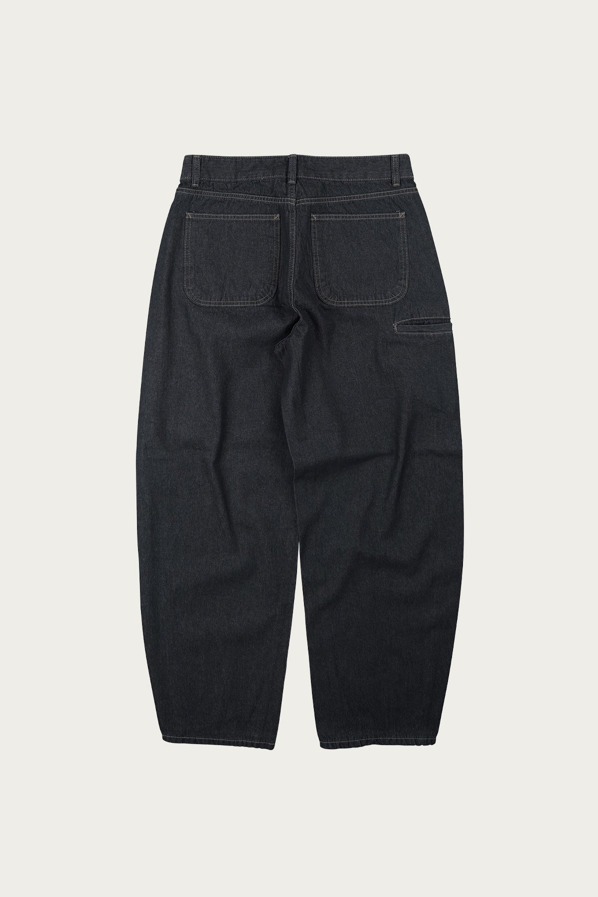 A relaxed five pocket denim cut with a subtle curved leg that tapers gently toward the hem, in a deep black rinse. Minimal, versatile, and built with classic five pocket construction and sturdy denim that holds its shape.