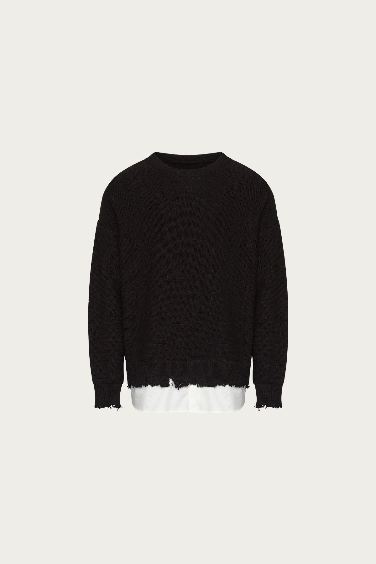 MM6 reworks the classic crewneck with a signature distressed knit that feels artful and lived in. Knit in a soft cotton yarn with an intentionally raw texture, the sweater has an easy everyday shape with long sleeves and a round neckline. The subtle white stitch line at the back marks it unmistakably as an MM6 piece. Made in Italy and finished with a gauzy open knit that gives the fabric movement and depth.