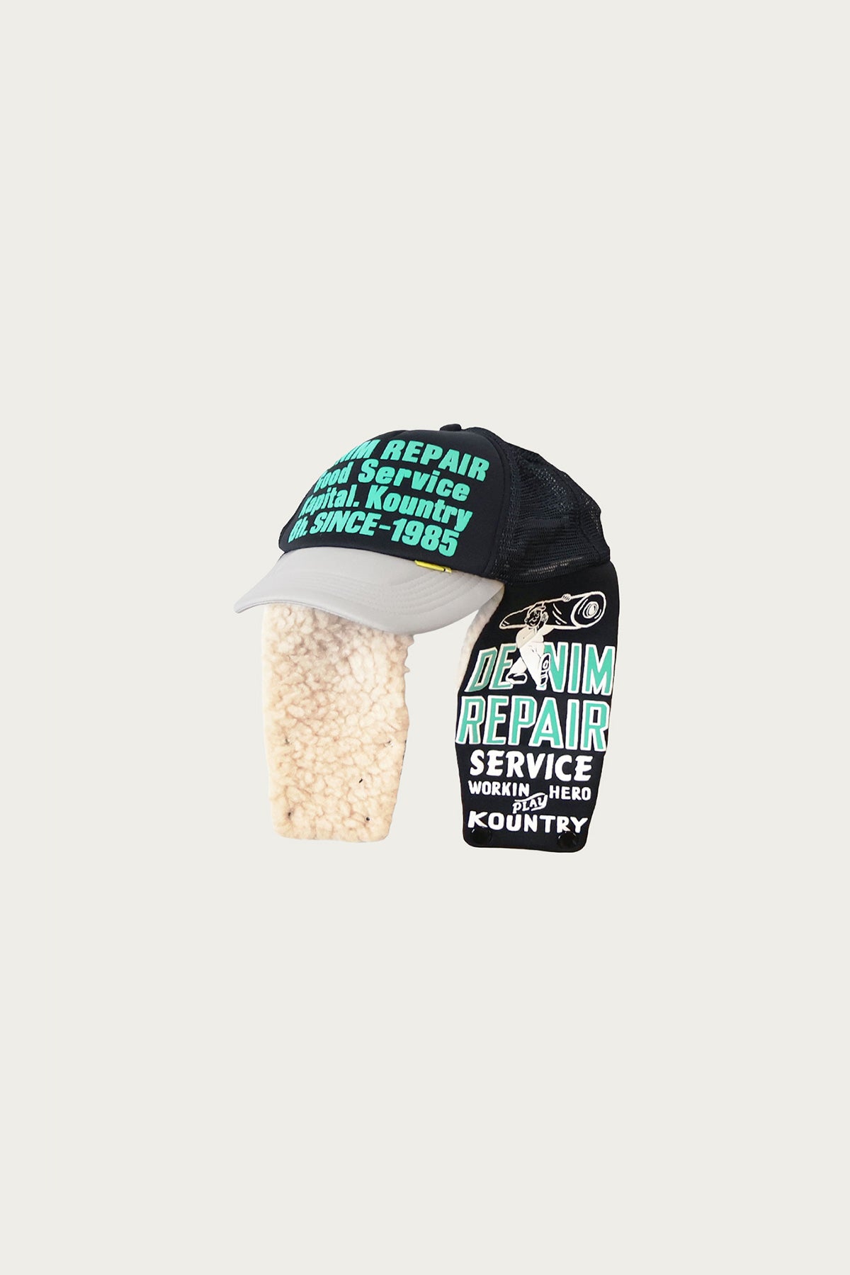 Kapital’s KOUNTRY line takes the classic trucker cap and turns it into something playful and full of character. This cap is printed with bold repair shop graphics that feel pulled from small-town Americana. The removable fleece ear flaps snap down when temps drop. It’s a cap with real personality that fits right into Kapital’s world of lived-in charm.