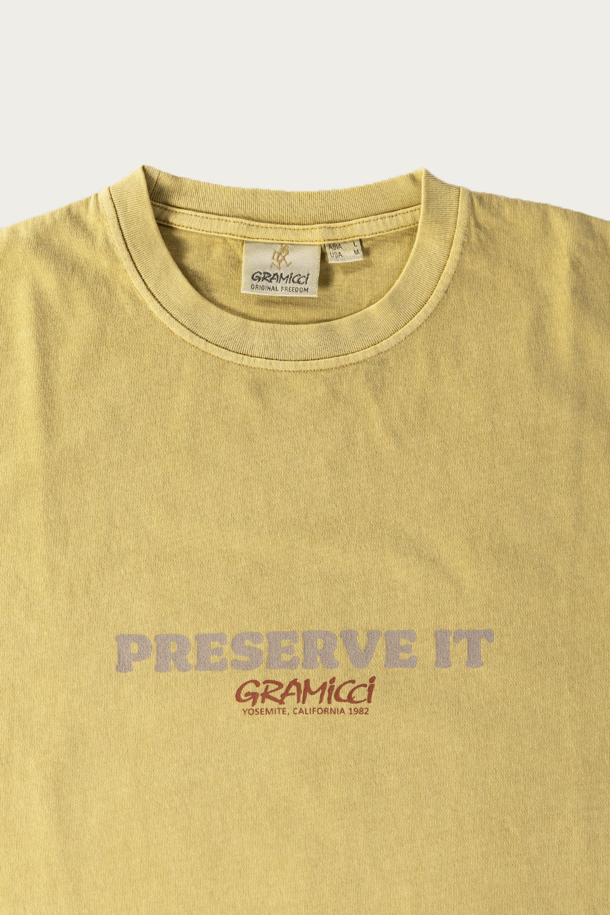 A relaxed graphic tee constructed from soft cotton and finished with a pigment dyed sulfur tone. The front features a “Preserve It” graphic that nods to Gramicci’s outdoor heritage and environmental ethos. The pigment dye gives the shirt a naturally faded appearance.