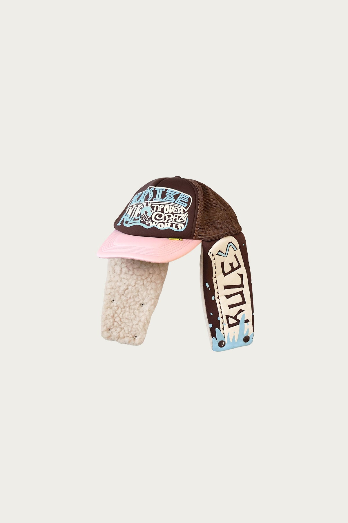 Kapital’s Kapsize Rulept cap flips the familiar trucker silhouette into something stranger and more charming. The structured front panel carries a hand-drawn graphic that feels like it wandered off a garage wall in a surf town, while the long sherpa-lined flaps give it a winter-friendly personality. It is playful, practical, and unmistakably Kapital.