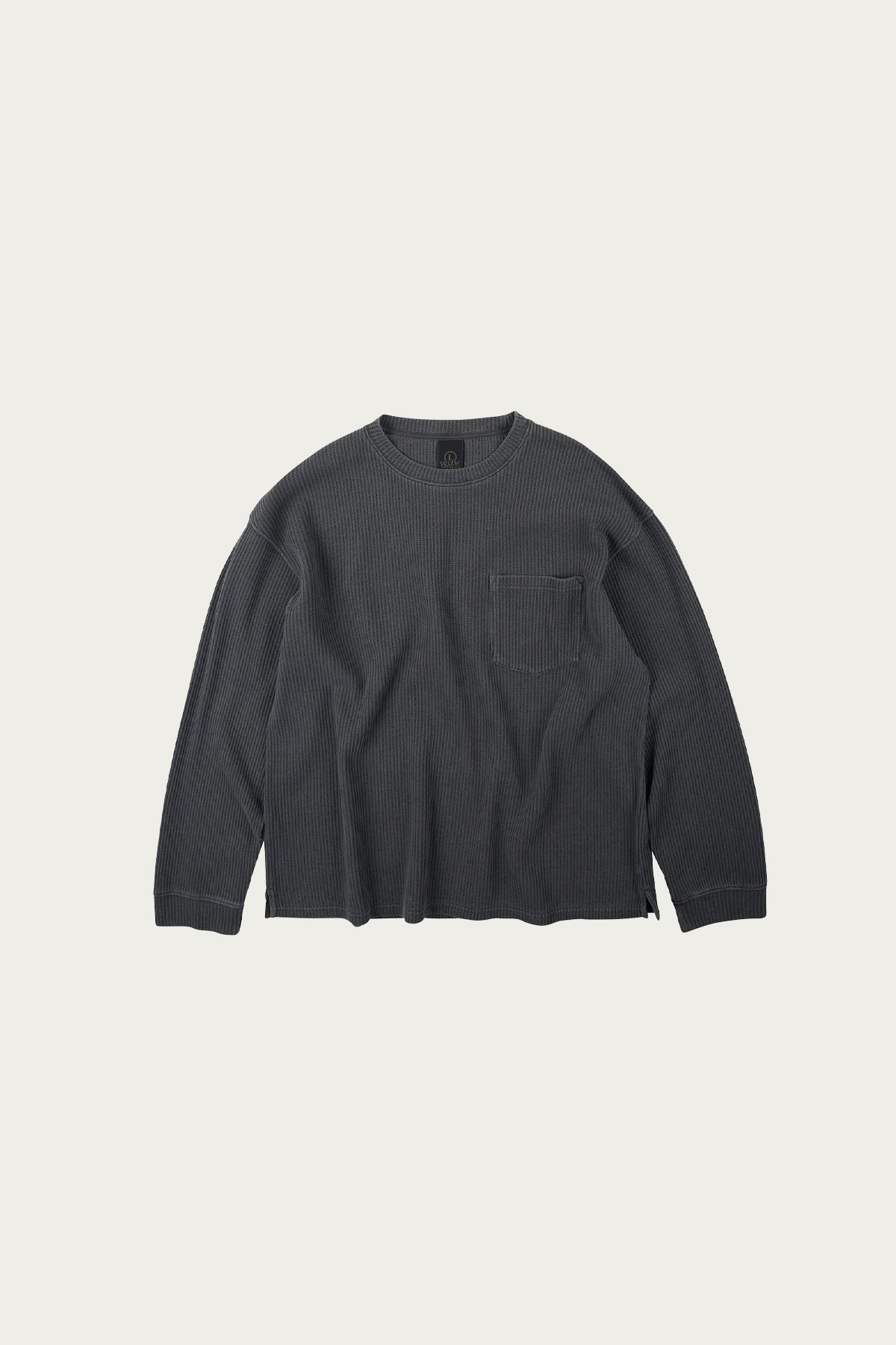 A textured waffle knit tee finished in a washed charcoal tone. The pigment dye gives it a lived in feel, while the pocket and textured surface add dimension to a simple shape.